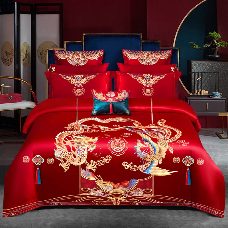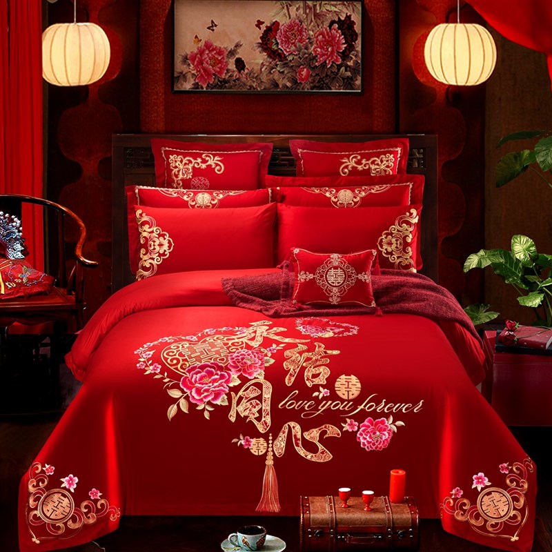 新婚庆四件套刺绣大红色喜被结婚房龙凤嫁礼六八件套纯棉床上用品