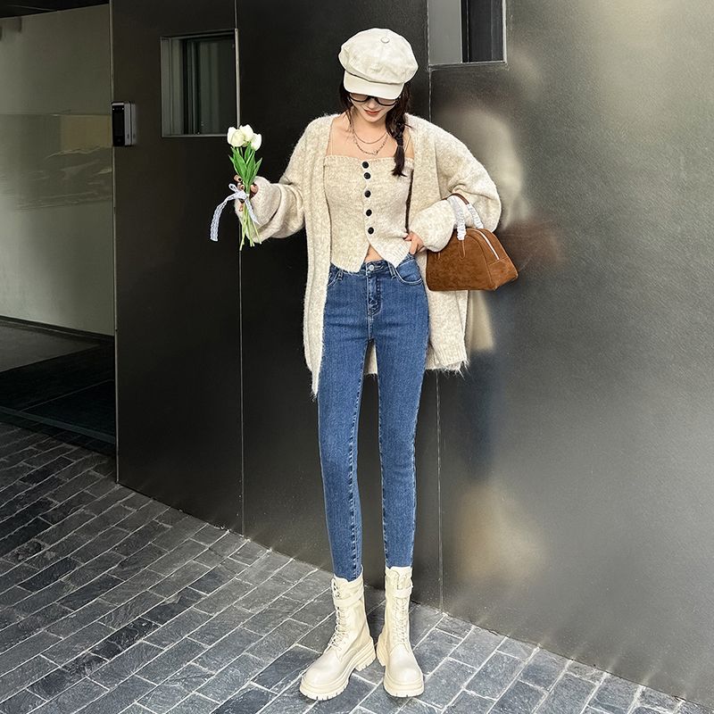 高腰牛仔裤女2025秋冬新款显瘦百搭紧身修身加绒加厚小脚铅笔裤子