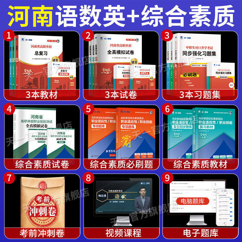 天一2026河南省高职单招复习资料教材综合素质职业技能测试专项题库高等职业院校单招语文数学英语全真模拟试卷单独招生考试知识点