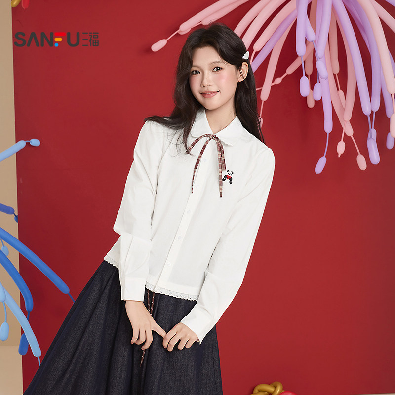 三福白色衬衫2026新款春季花边娃娃领衬衣刺绣长袖上衣女装517519