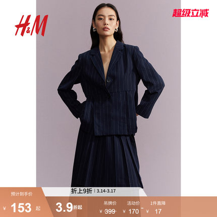 HM女装西装春季垫肩褶裥长袖单排扣条纹休闲外套1211493