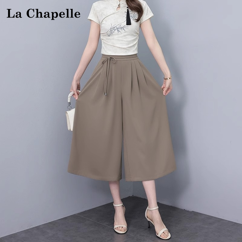 拉夏贝尔国风冰丝雪纺裙裤女2025夏薄款高腰宽松垂感七分阔腿裤子