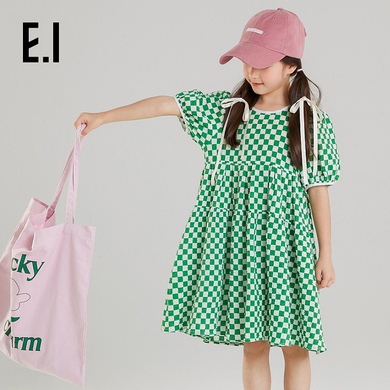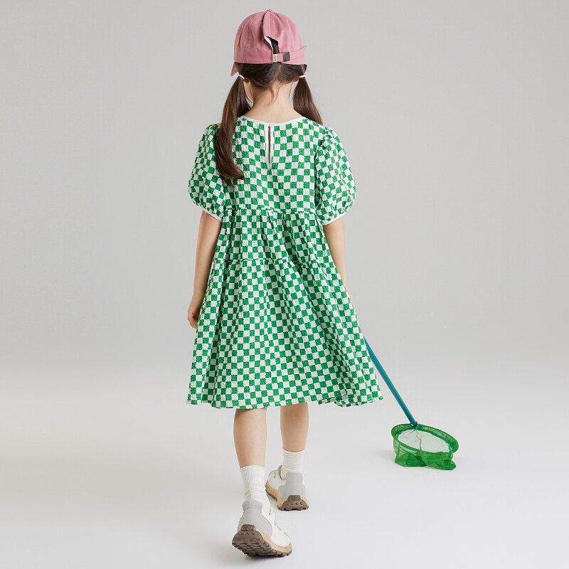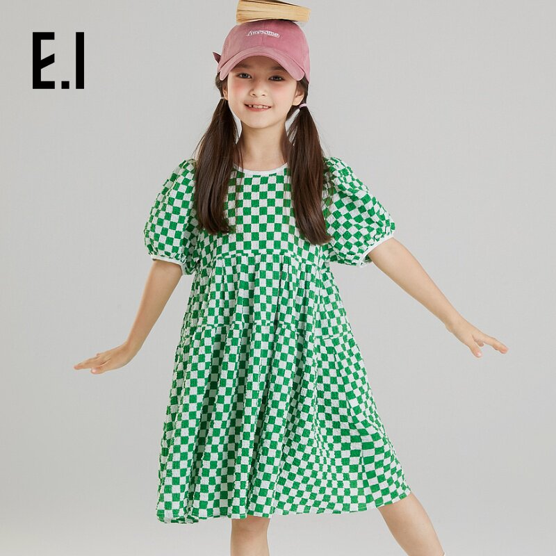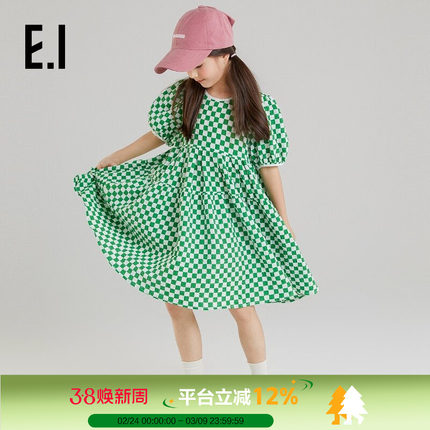 ei童装女童连衣裙夏季款复古绿色棋盘格中大童短袖A字裙亲子装