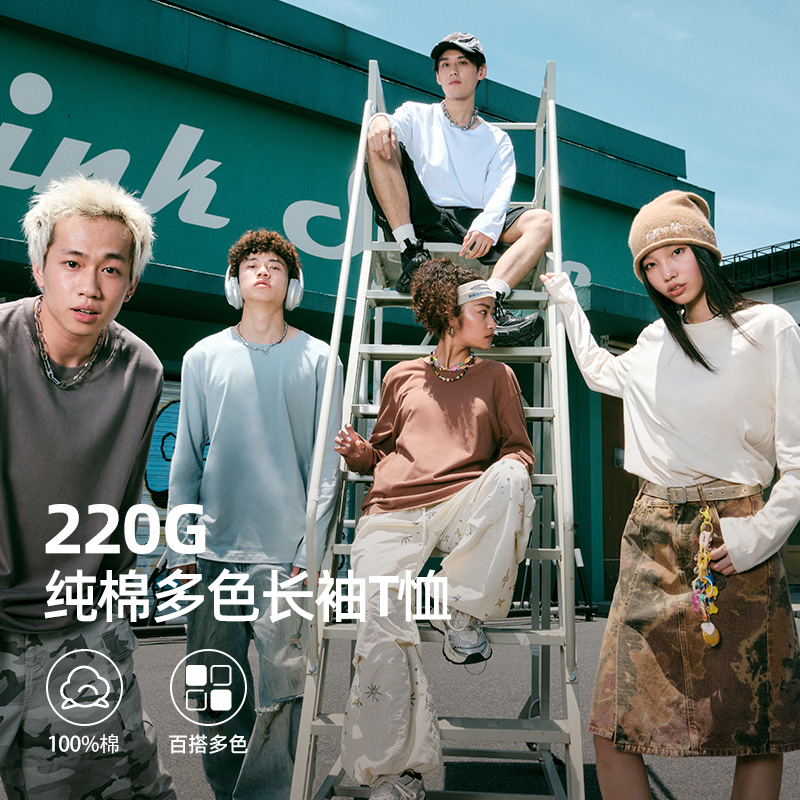 回力春秋季休闲长袖打底衫男士重磅纯棉t恤男款白色宽松圆领上衣A
