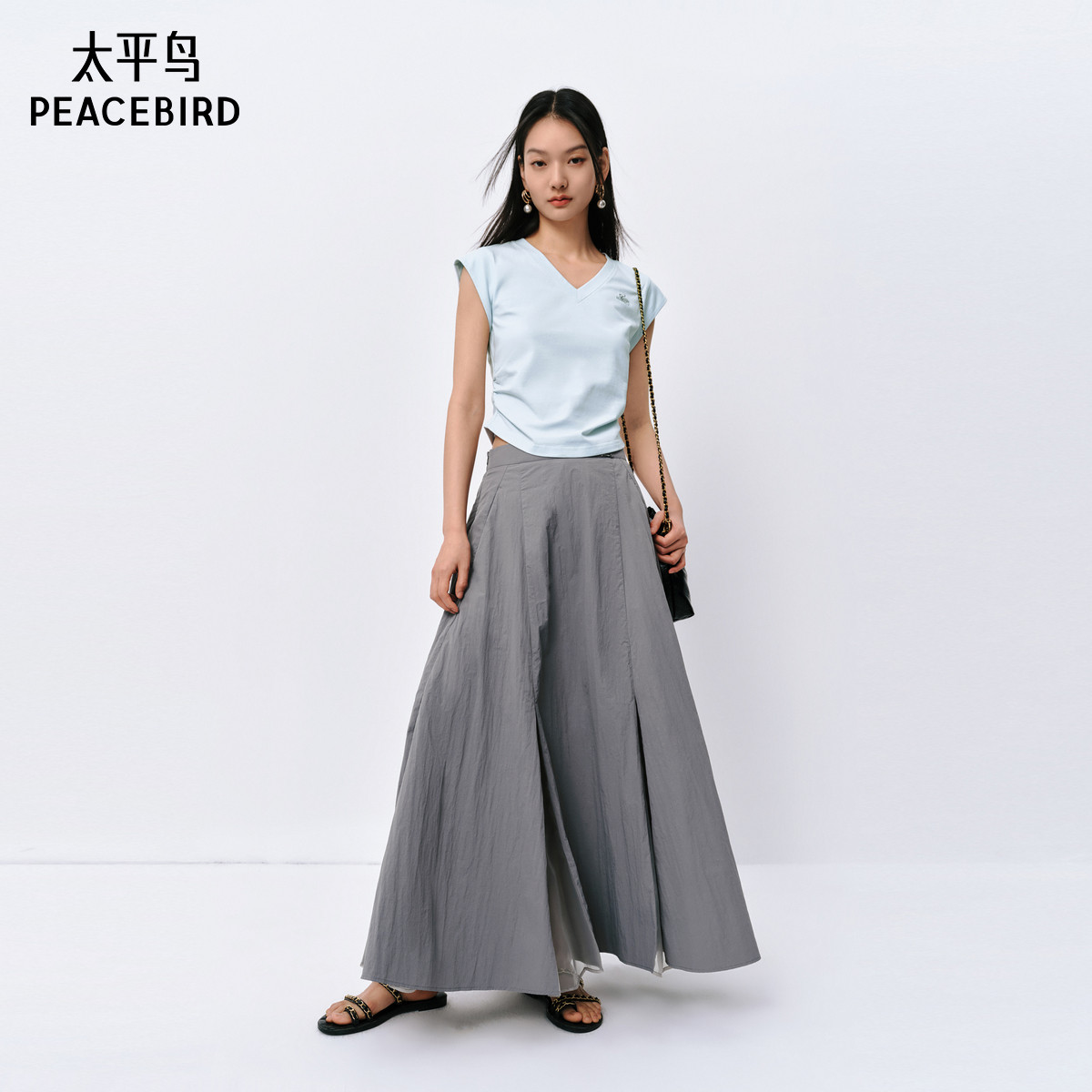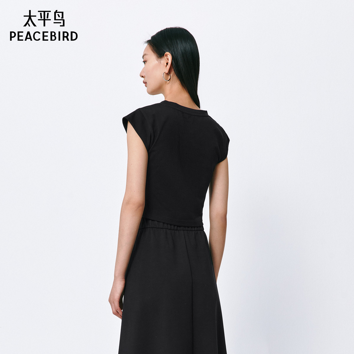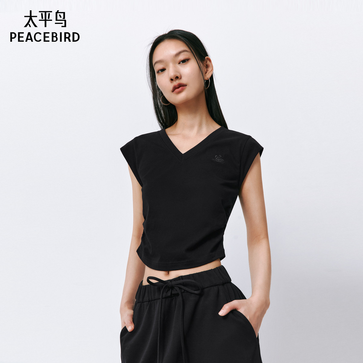 太平鸟V领纯色T恤女短袖小飞袖收腰简约通勤时尚短上衣
