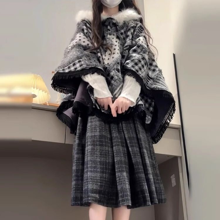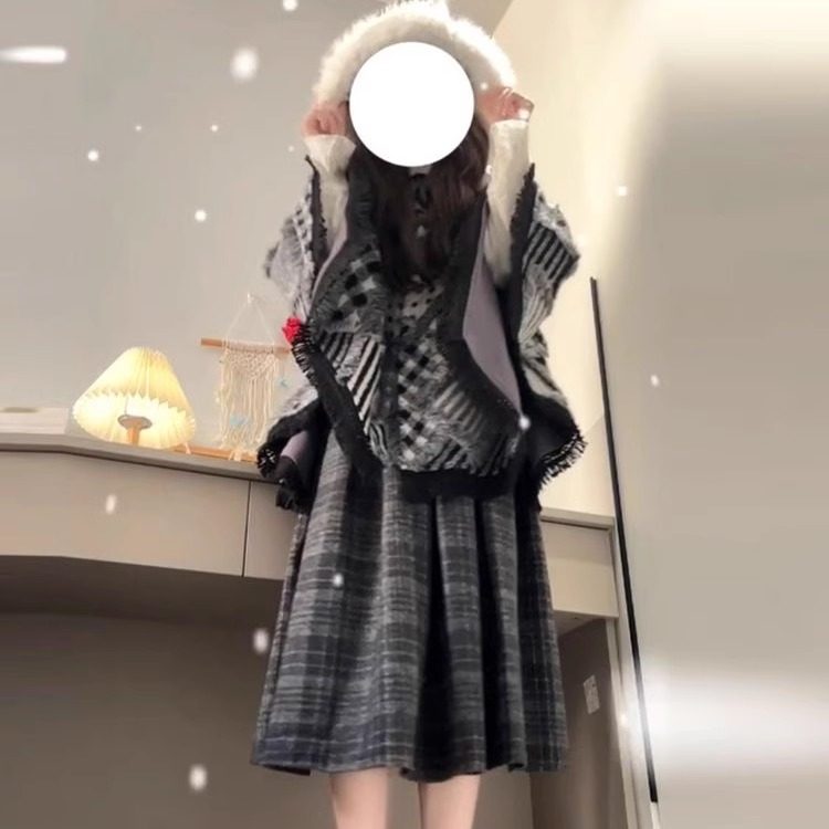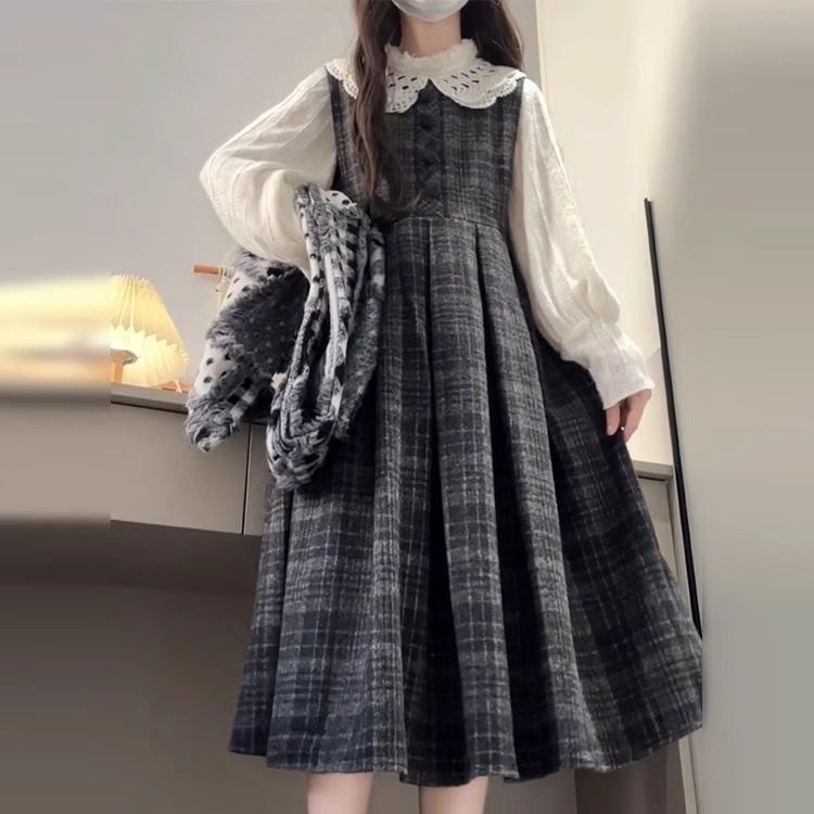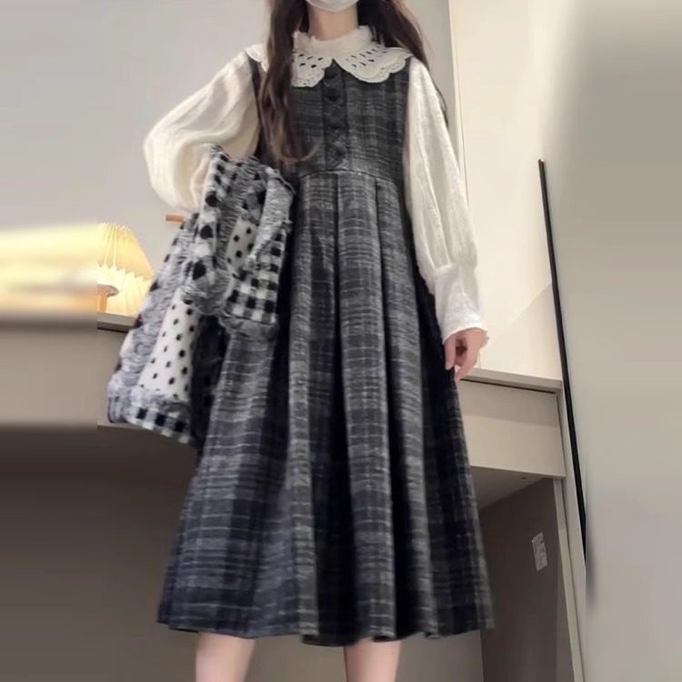 单件套装格纹娃娃领蕾丝背带连衣裙女学生日系复古中长款背心裙子
