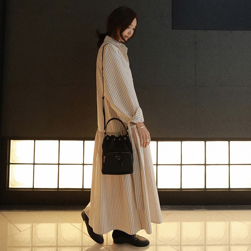 2018春夏新款韩版过膝长款条纹衬衫连衣裙女宽松大码系带百搭裙子