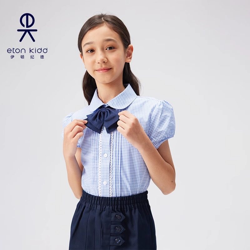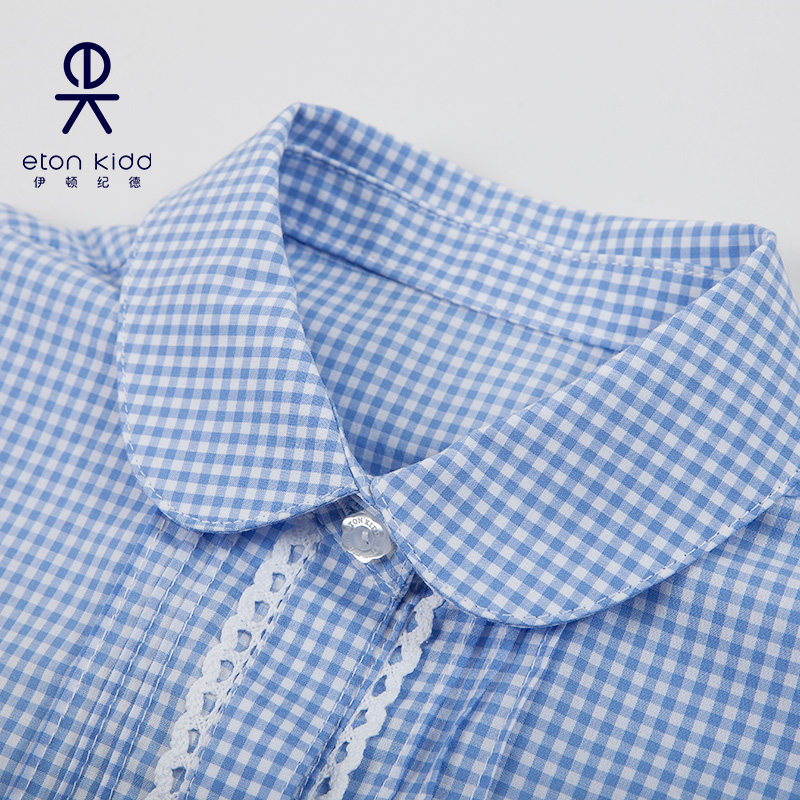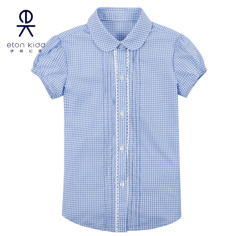 伊顿纪德全棉牙签褶花边拼接小圆领女通短袖衬衫泡泡袖衬衣16C202