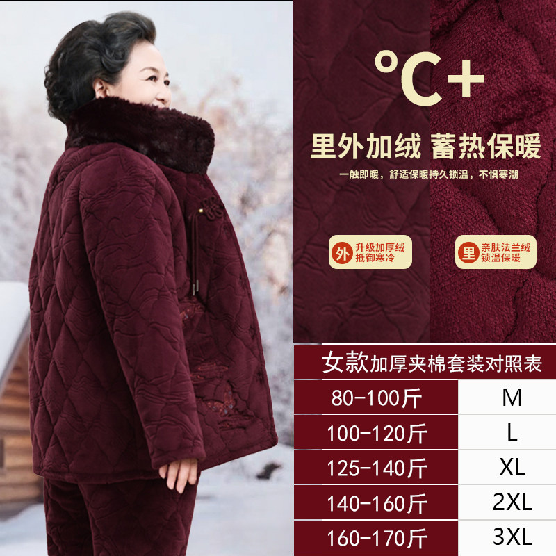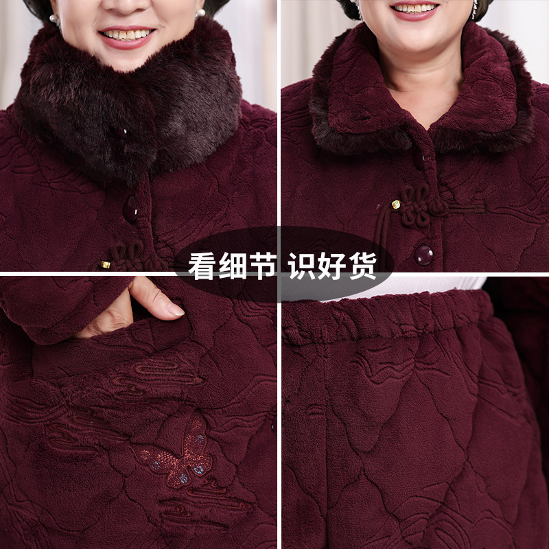 冬季棉服中老年大码夹棉睡衣女珊瑚绒绒保暖加厚加绒妈妈家居套装
