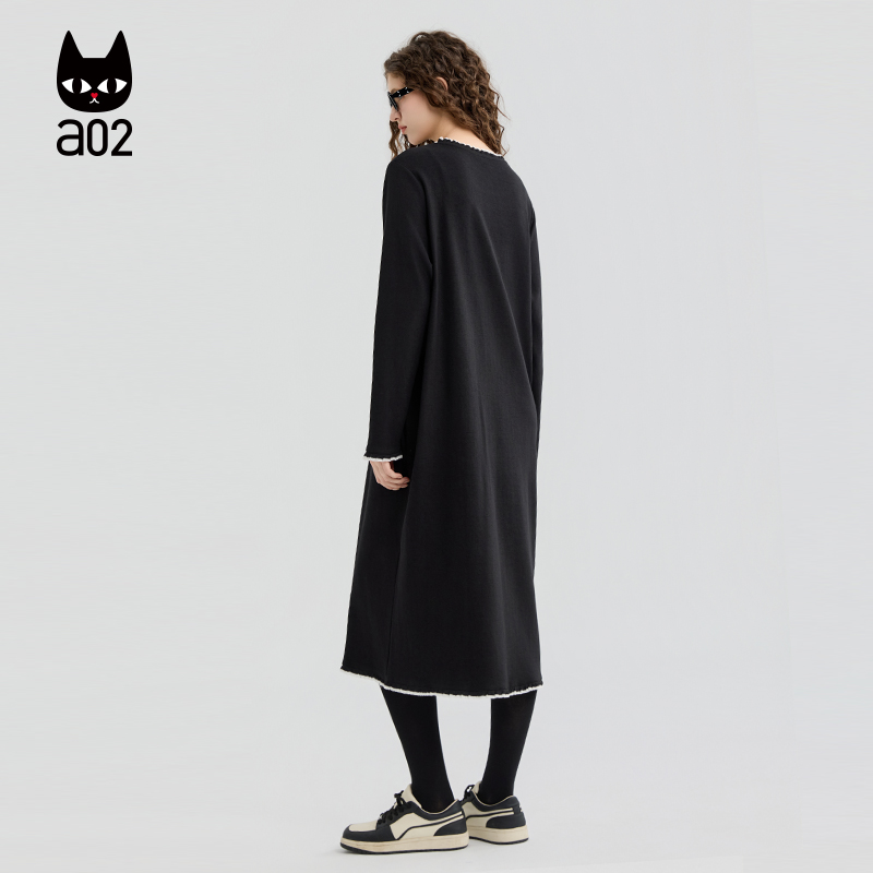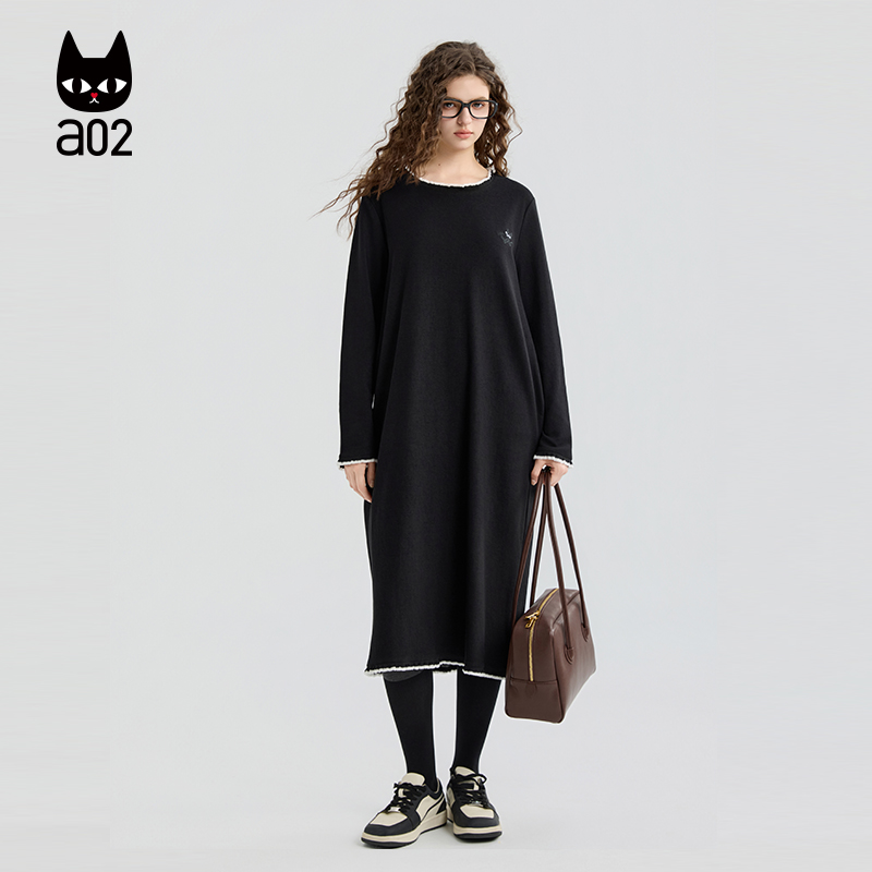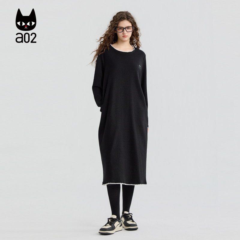 a02宽松针织连衣裙女2025新款秋季通栏松弛感长裙设计感黑色裙子
