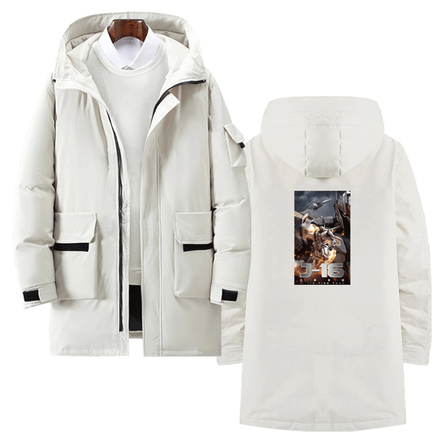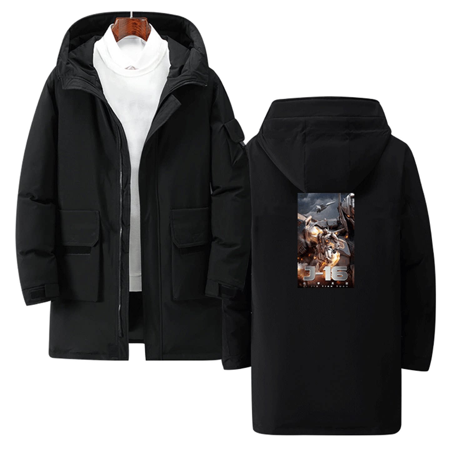 国潮动漫机甲纪元J-16变形男女外套定制中长款羽绒服战术机甲潜龙