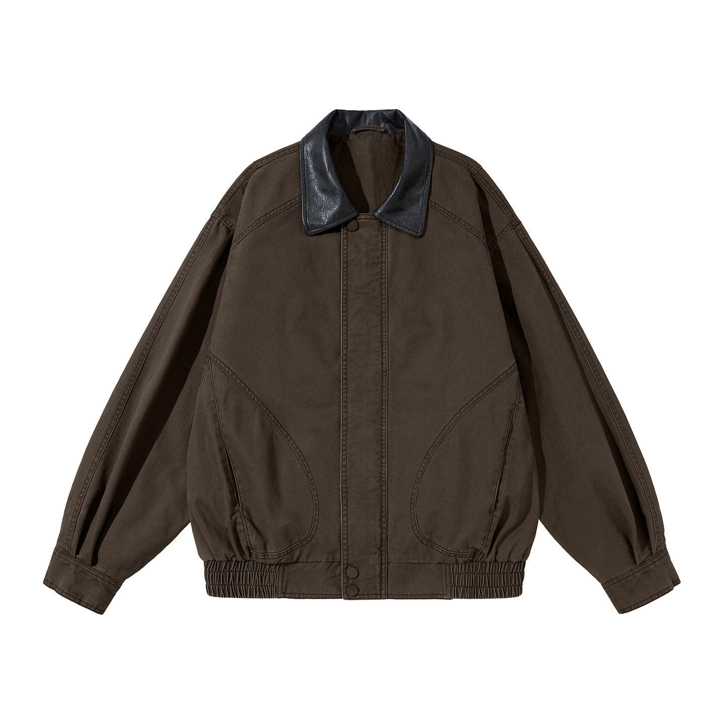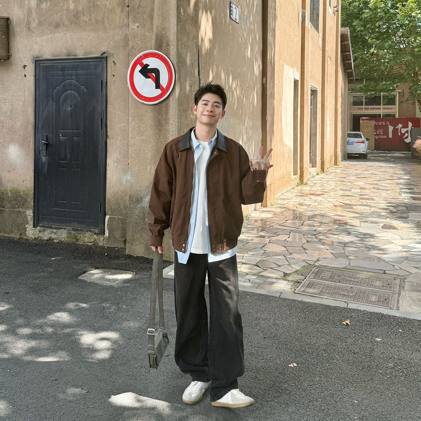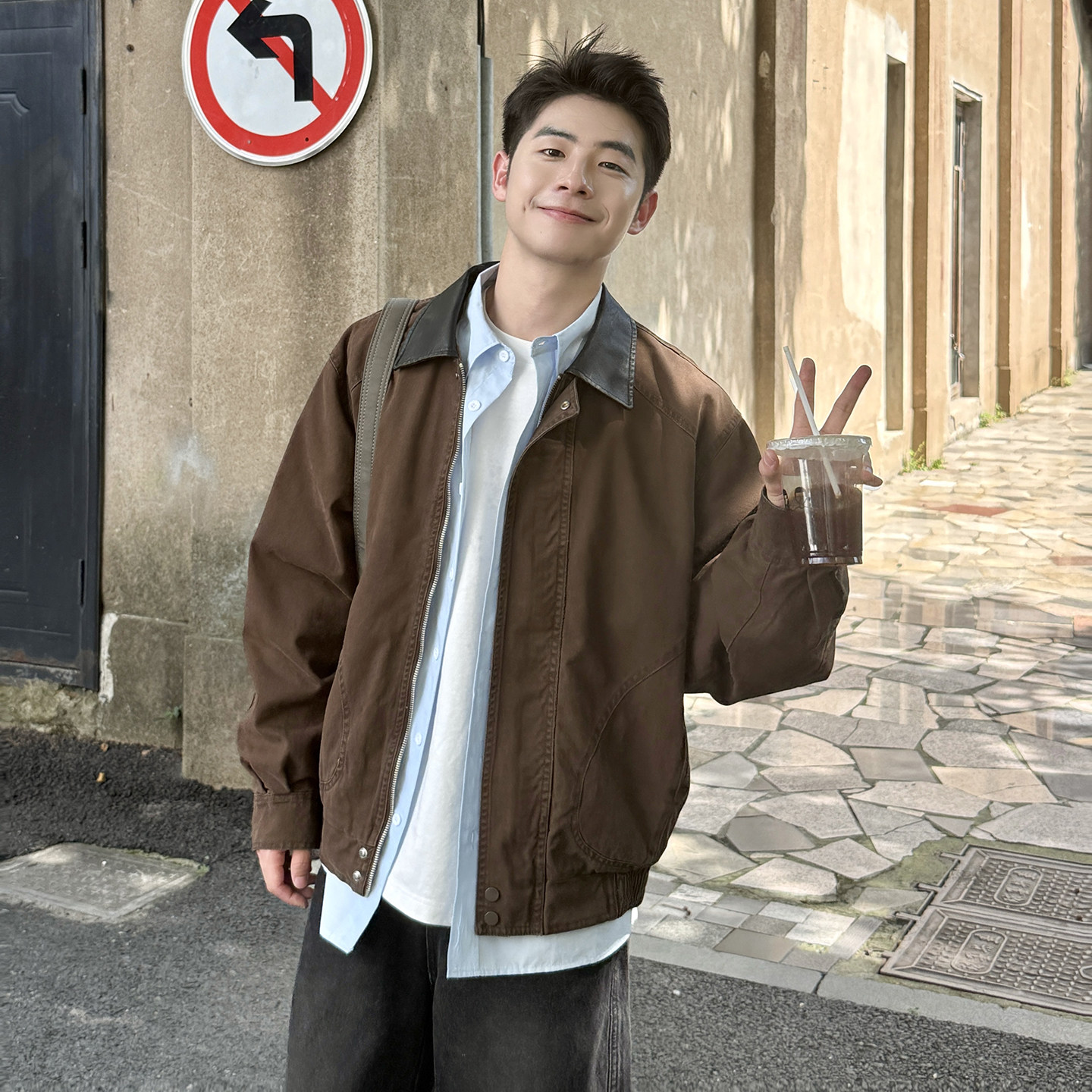咖啡色翻领复古工装夹克男生新款春秋季宽松休闲百搭潮流外套上衣
