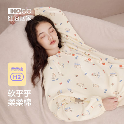 红豆居家柔柔棉春秋季纯棉睡衣女长袖可爱无领全棉柔软家居服套装