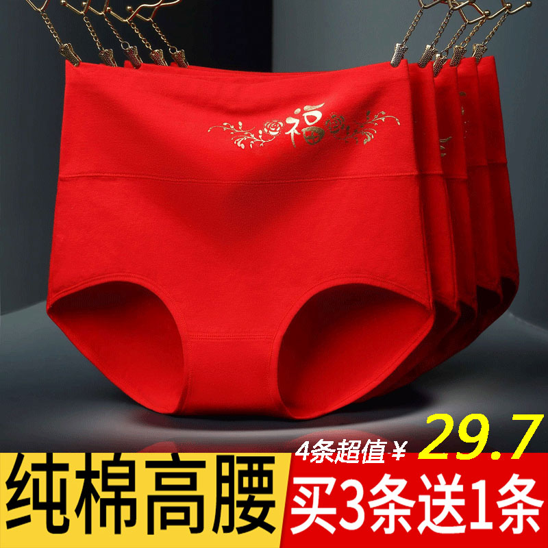 本命年纯棉女士内裤结婚大红胖mm高腰收腹抗菌三角女裤头大码牛年