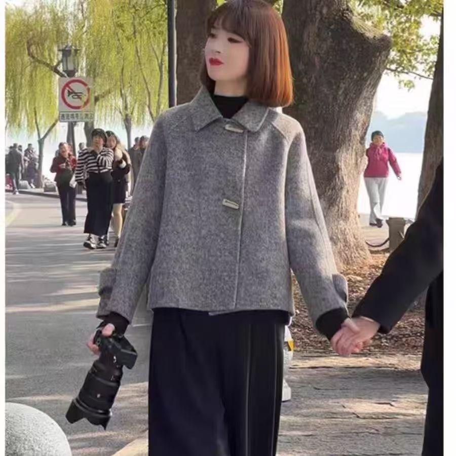 双面羊绒大衣女2025秋冬新款翻领气质简短款羊毛呢外套小个子灰色