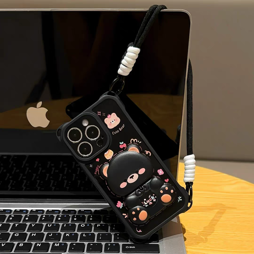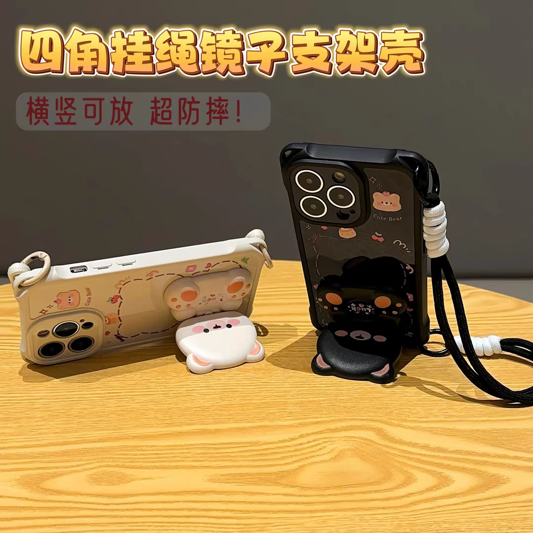可爱小熊支架适用苹果16pro手机壳iphone15保护套女款reno14/a5四角挂绳vivox200/s30硅胶小米15/k80/note14