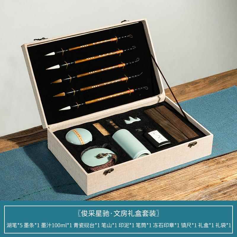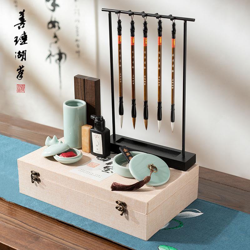 新款善琏湖毛笔湖笔俊装采星驰文房四宝套装毛笔套砚台墨条专业笔