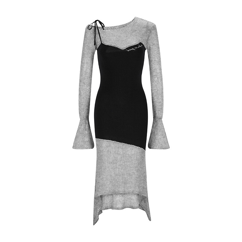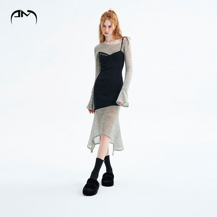 Azepam 时髦前卫设计感 假两件拼接不规则鱼尾毛织吊带连衣裙
