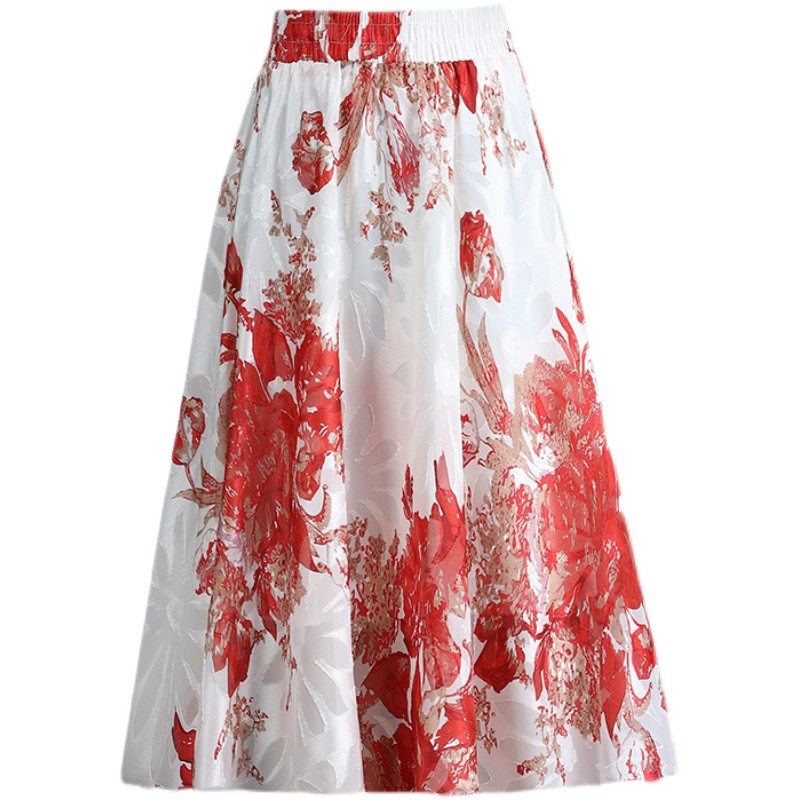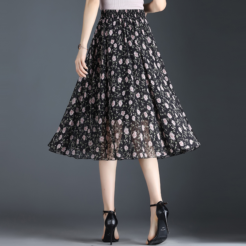 提花雪纺半身裙女夏季中长款2021新款高腰垂感碎花裙流行a字裙子