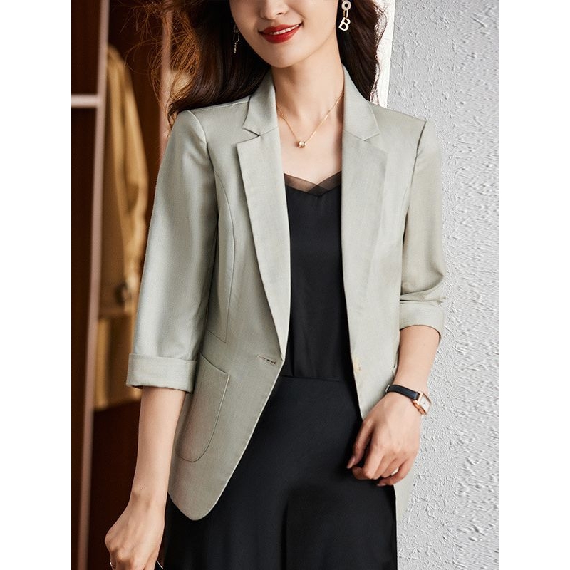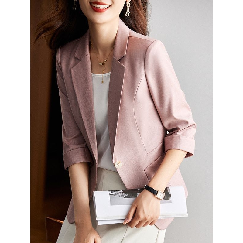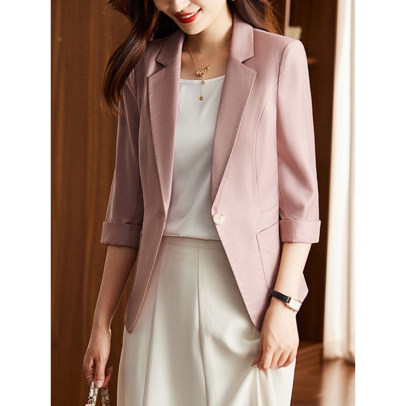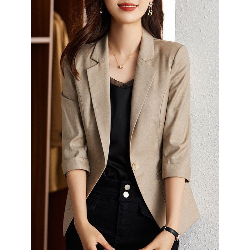七谷娘杏色休闲小个子西装外套女春秋2023亚麻气质职业装短款西服