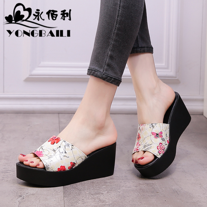 夏季厚底牛皮外穿休闲风坡跟拖鞋