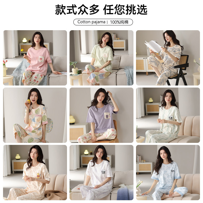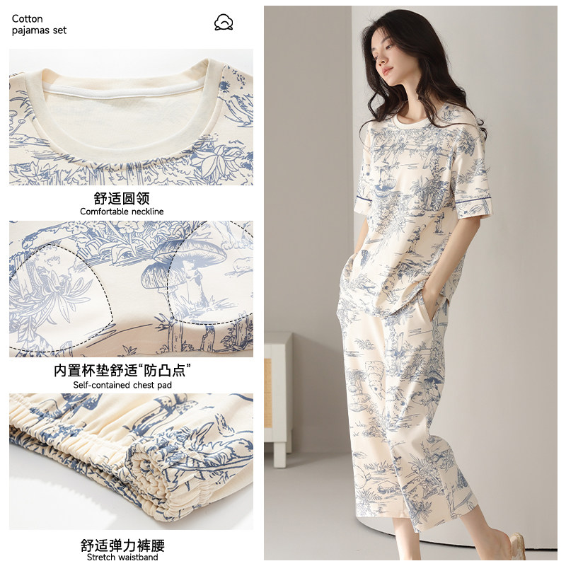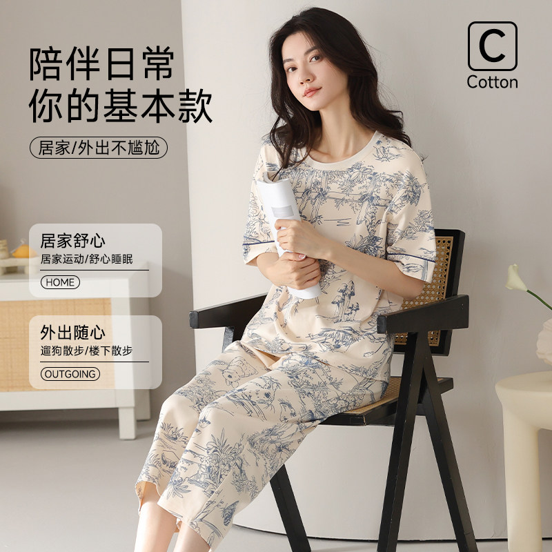 猫人纯棉睡衣女款夏季水墨国风短袖七分裤套装可外穿带胸垫家居服
