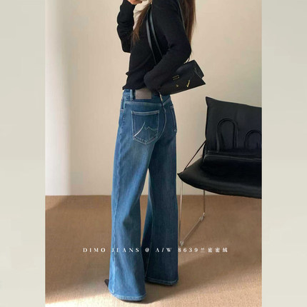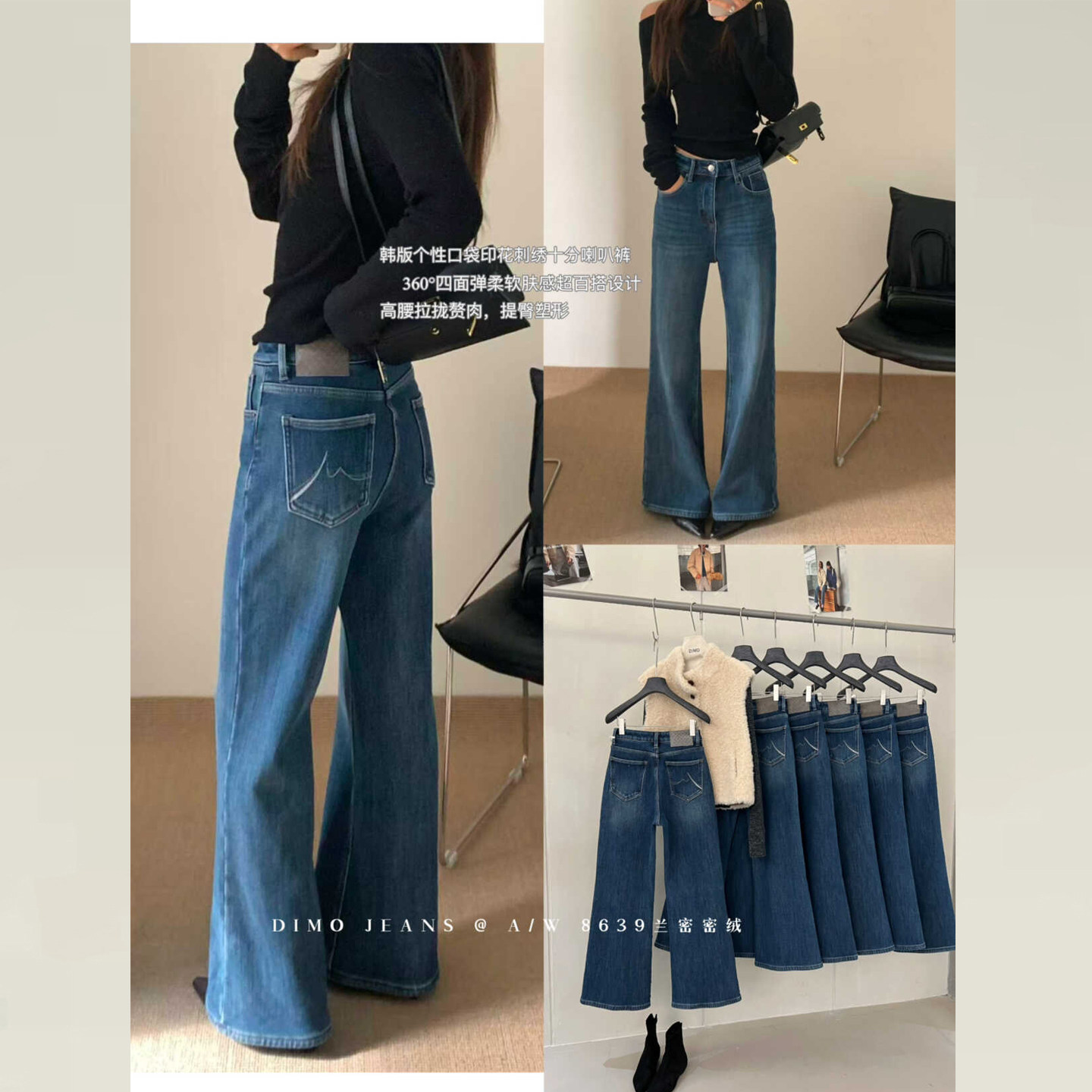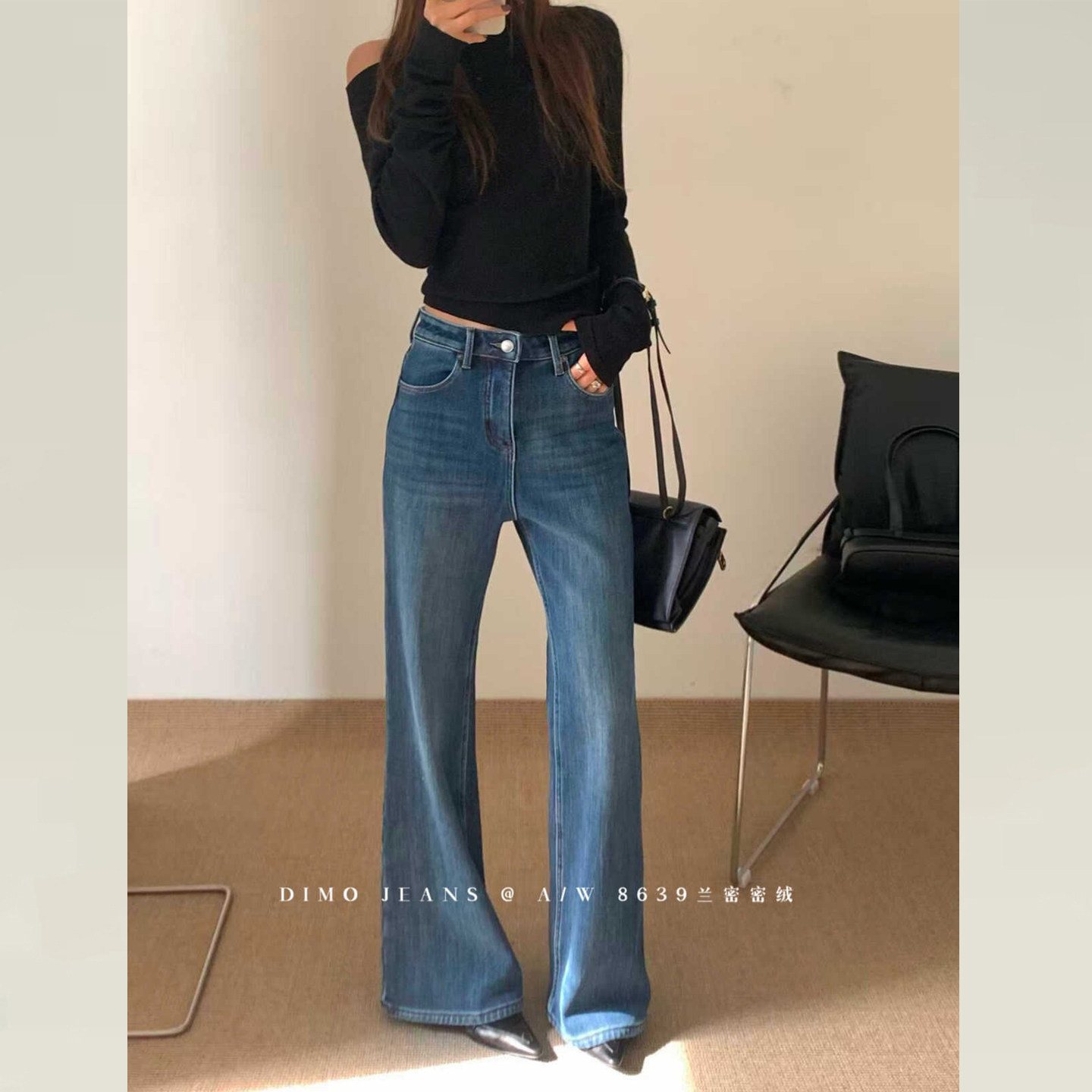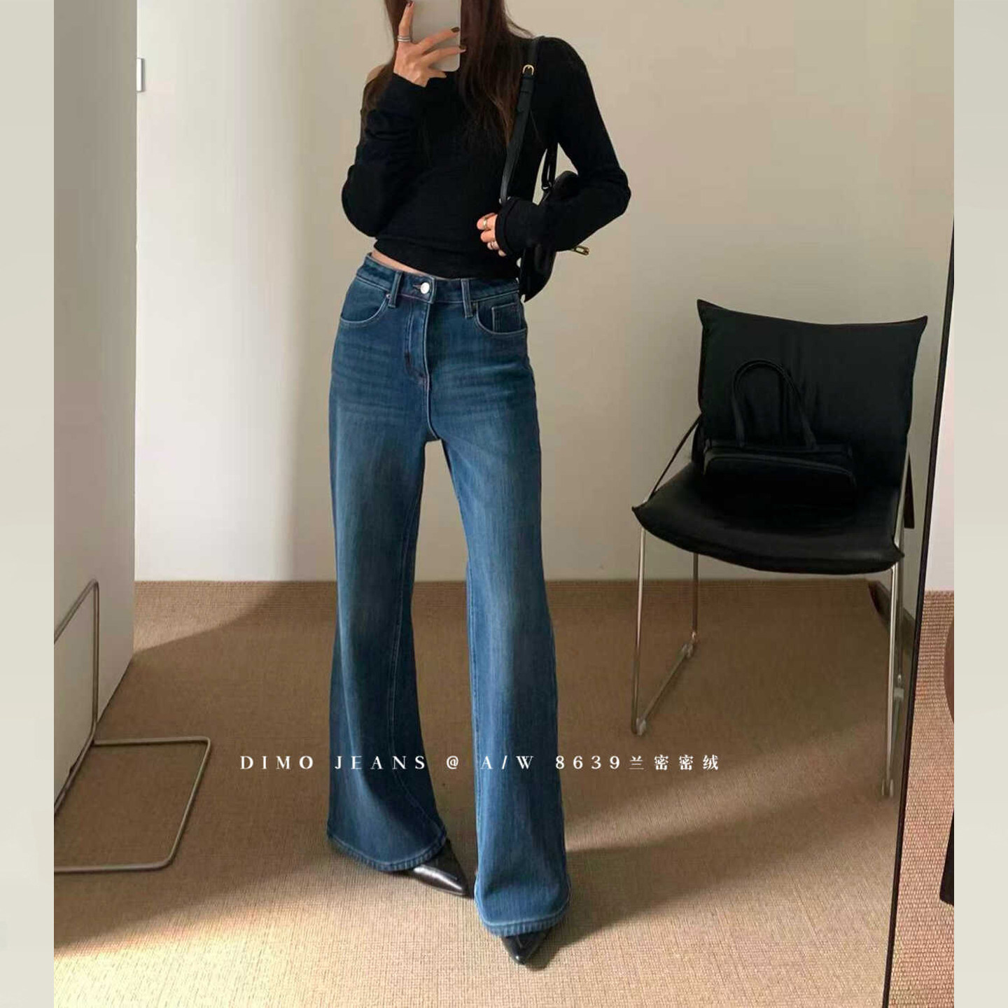DIMO蓝色加绒牛仔裤冬加厚版型超好看的裤子高腰显瘦不贴腿微喇裤