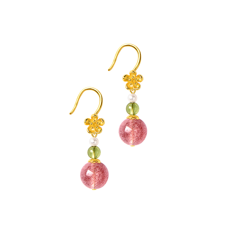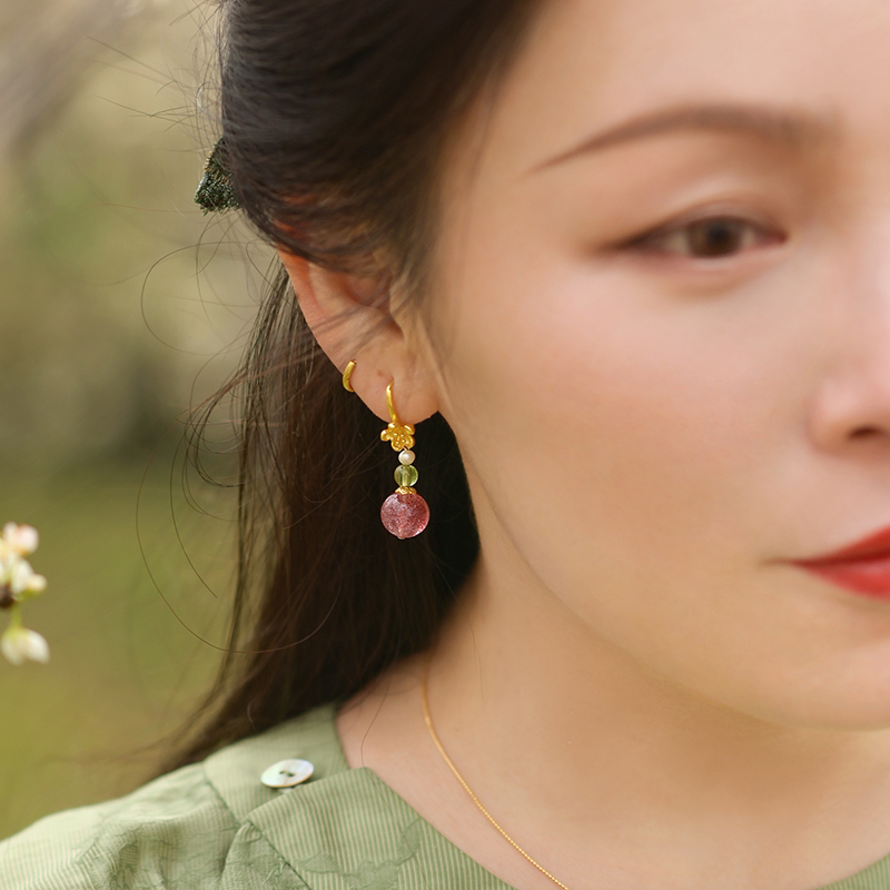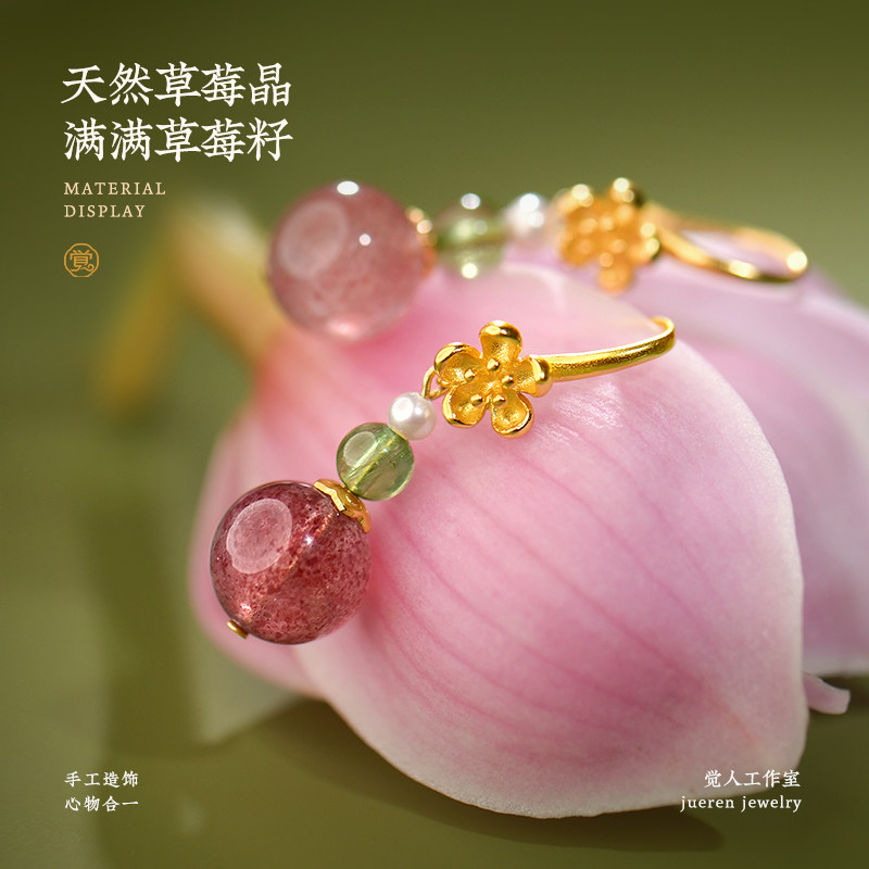觉人原创鸽血红草莓水晶耳饰纯银镀金海棠花耳环女【春日莓好】