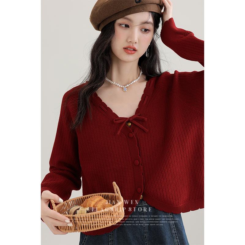 酒红色系带V领针织开衫女2025春秋新款宽松小个子短款毛衣外套潮