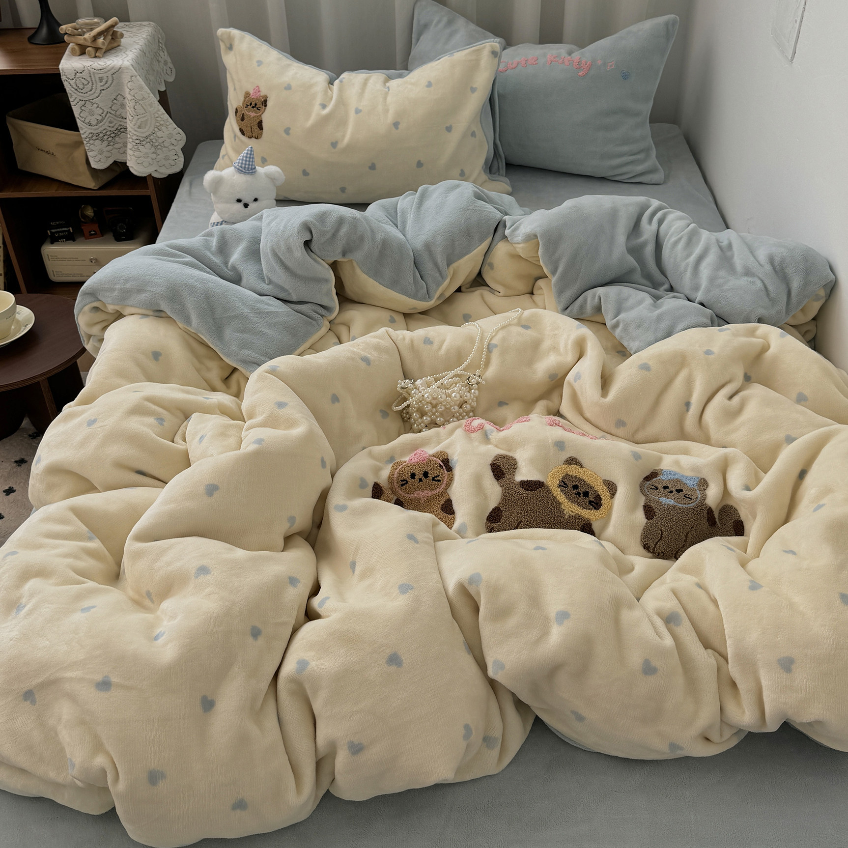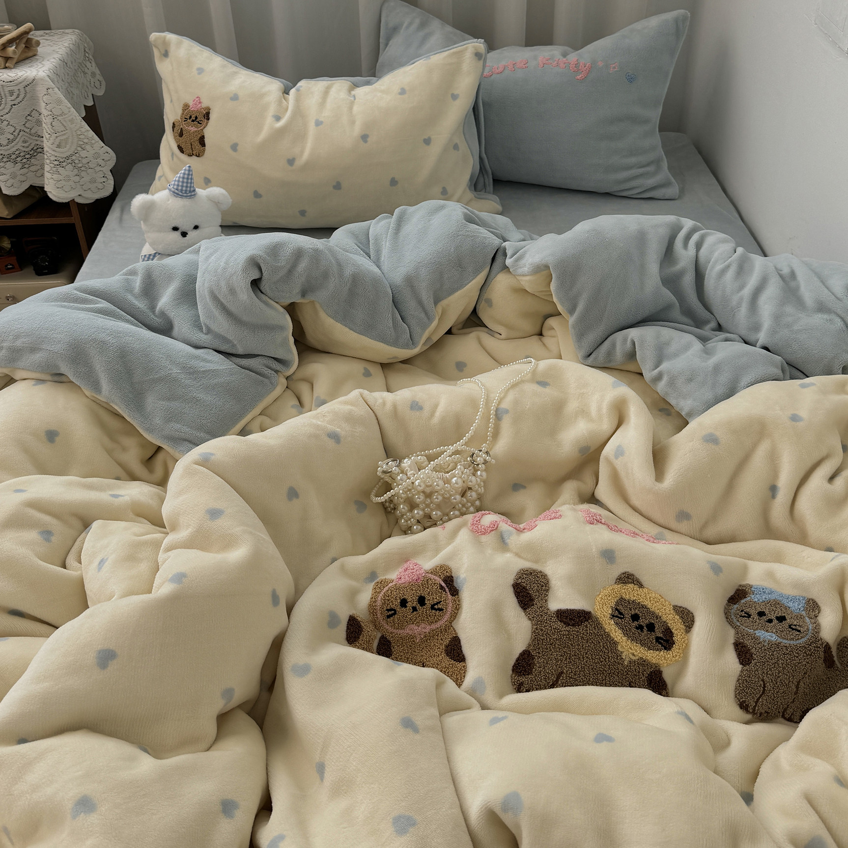 ins爱心猫咪毛巾绣冬季保暖牛奶绒四件套加厚珊瑚绒法兰绒三件套