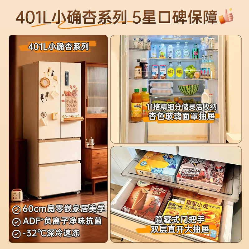 美菱小确杏401L法式四门超薄零嵌入冰箱家用一级节能官方正品