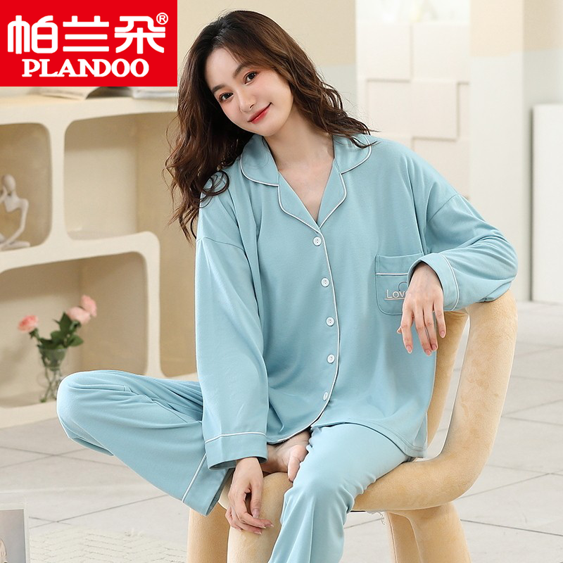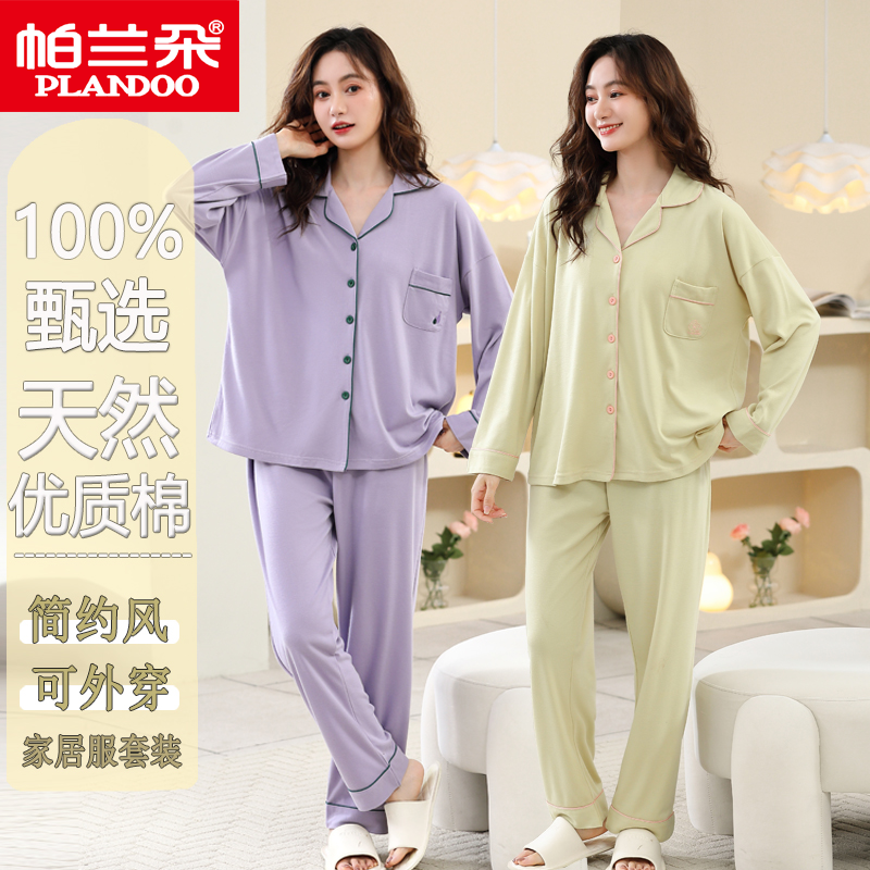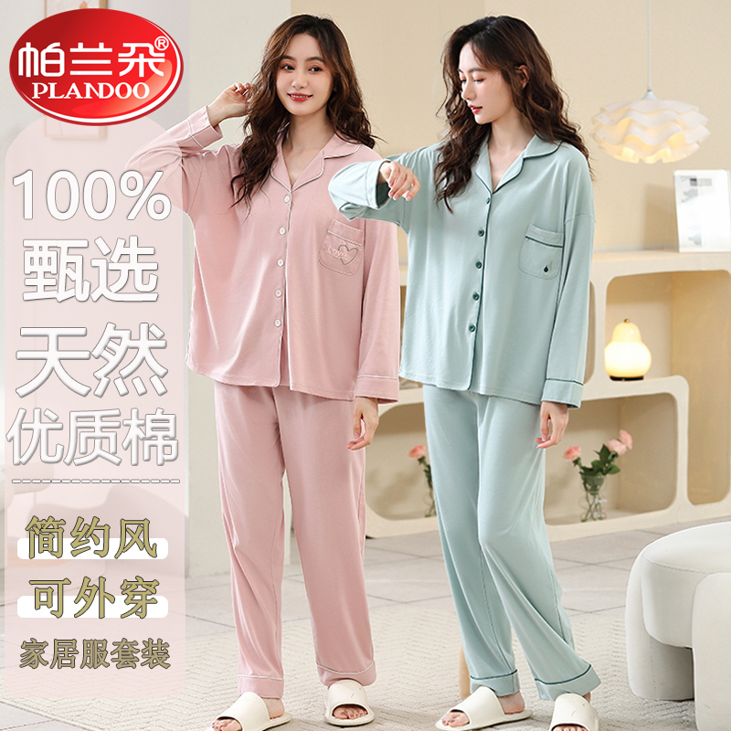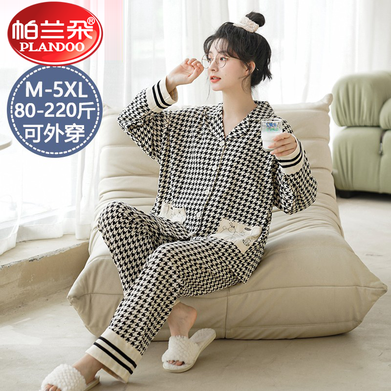 帕兰朵纯棉睡衣女夏春秋季薄款长袖长裤宽松套装加大码胖mm家居服