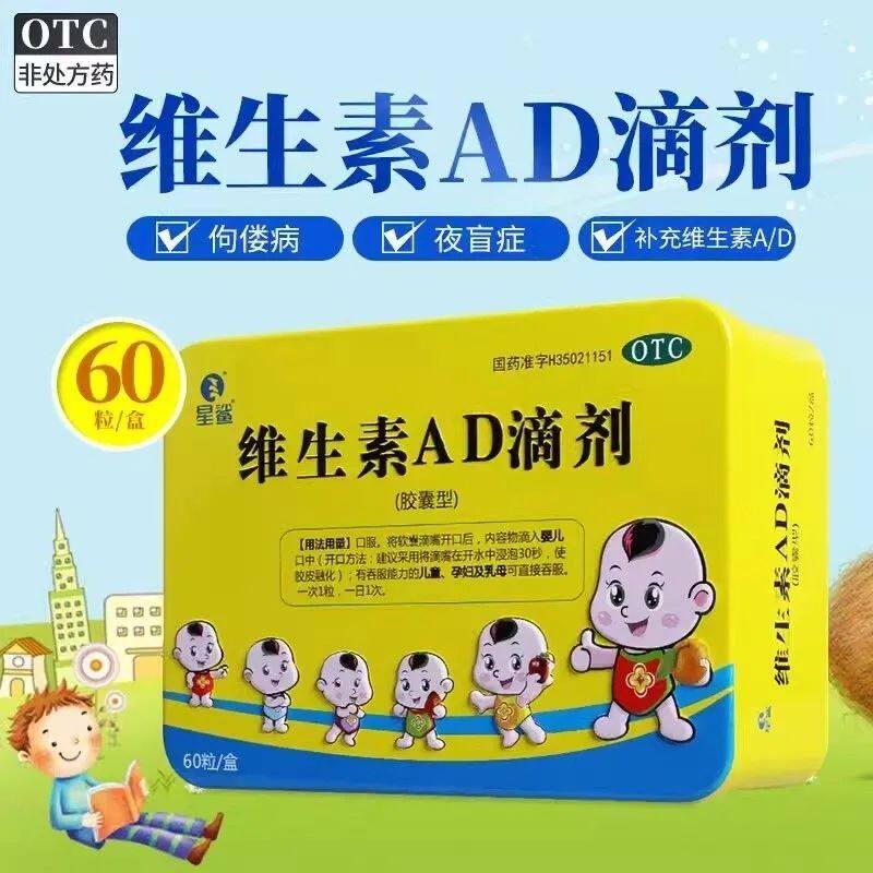 星鲨维生素AD滴剂小儿手足抽搐夜盲症佝偻病60粒正品