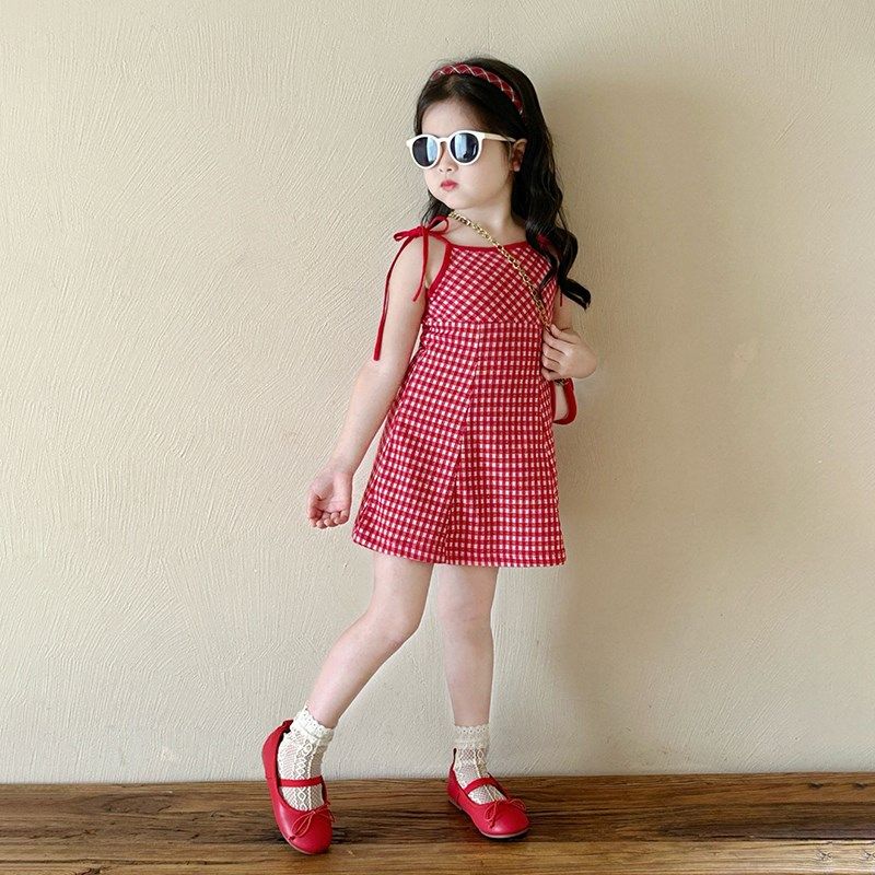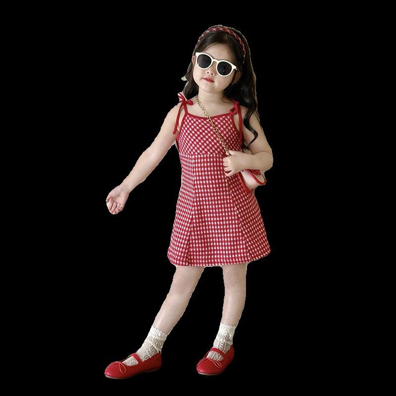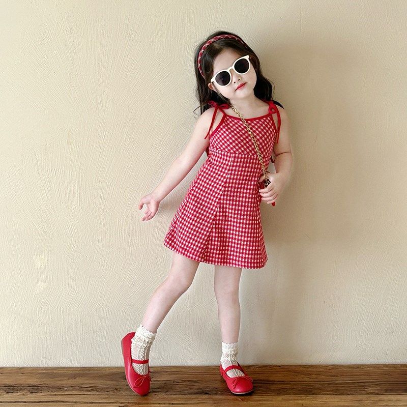 夏款童装女中大童夏季新款显白红色格子系绳吊带连衣裙时髦吊带裙
