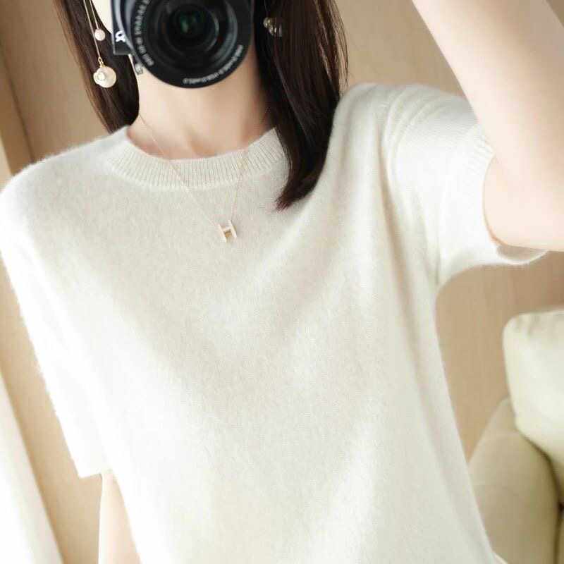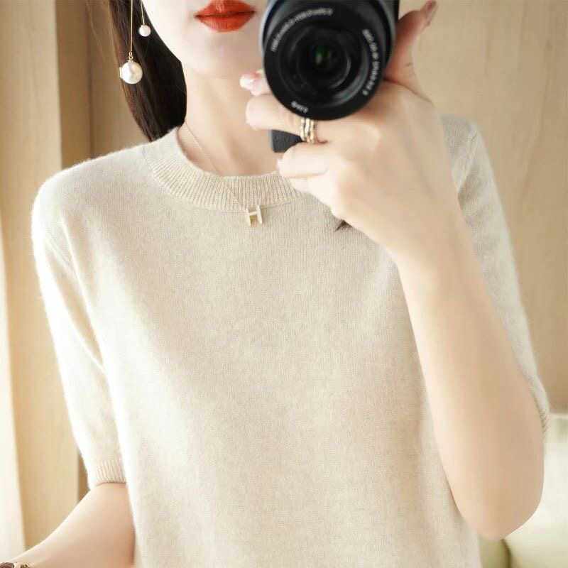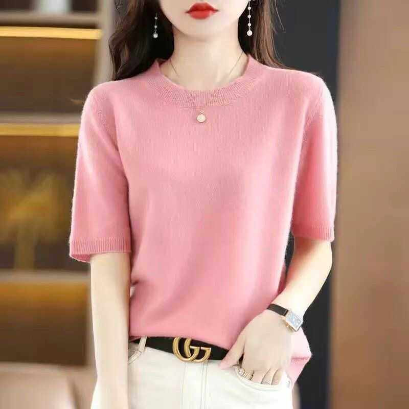 2024春秋圆领套头毛衣女中袖打底衫宽松五分袖针织短袖女内搭上衣