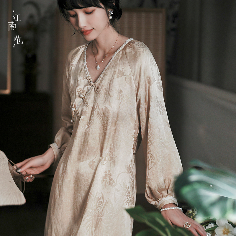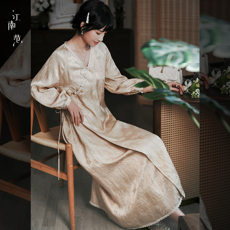 江南范新式改良汉服V领中长款日常可穿低领国风连衣裙2024款秋季