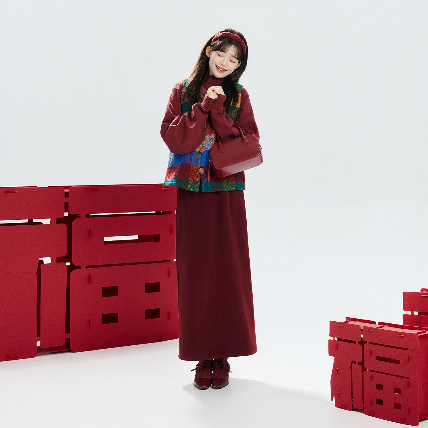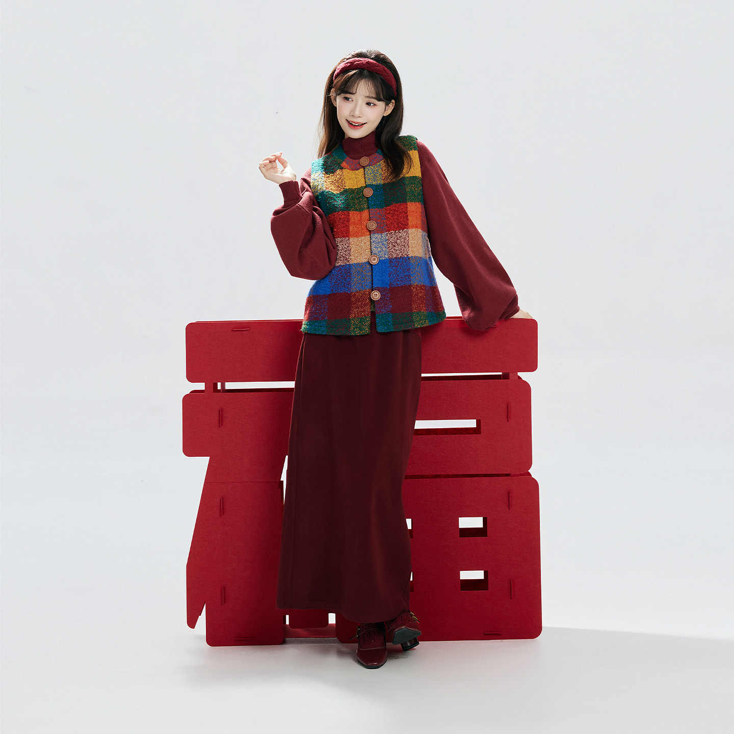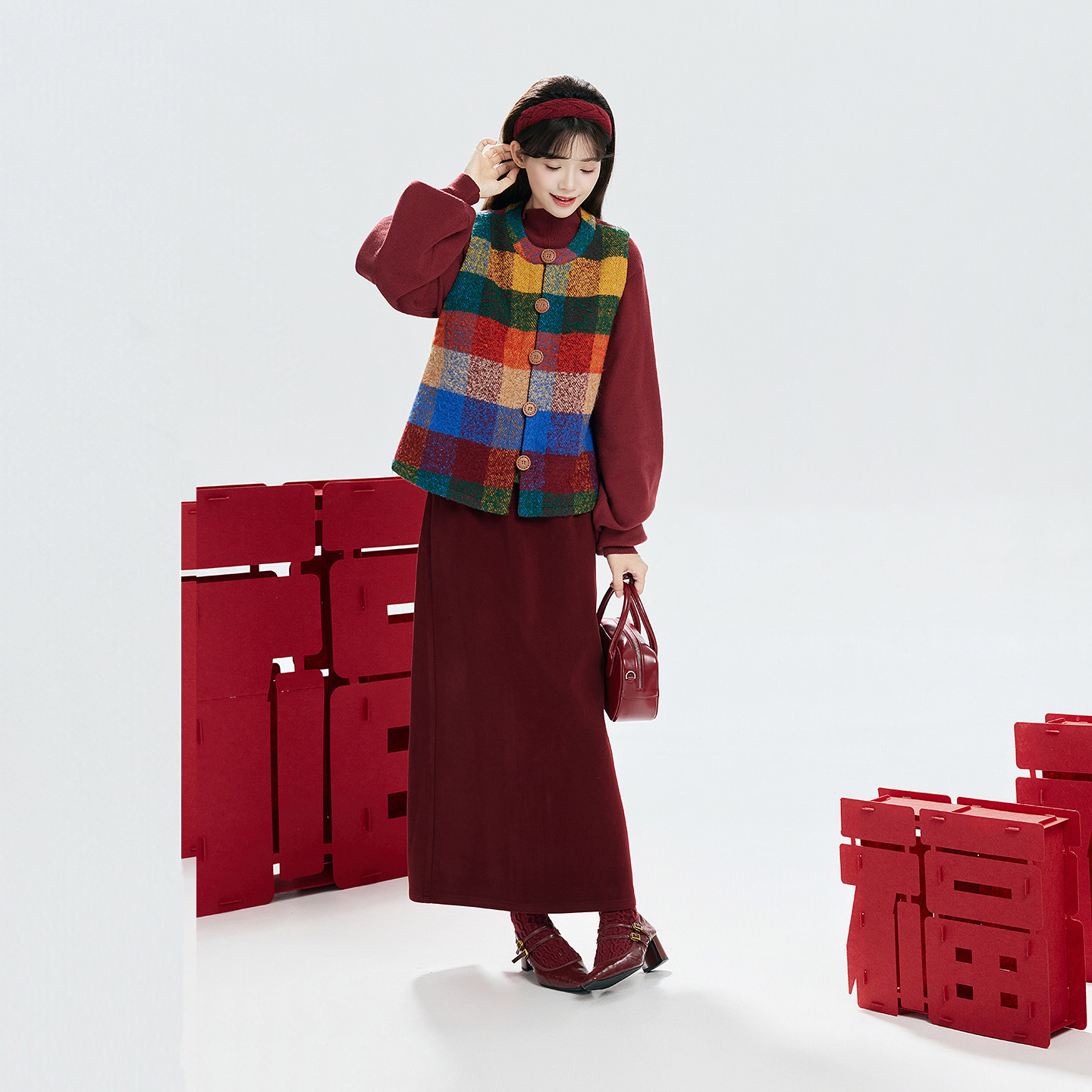 织造司[虹云]新中式红色过年穿搭国风马甲毛衣女秋冬半身长裙套装