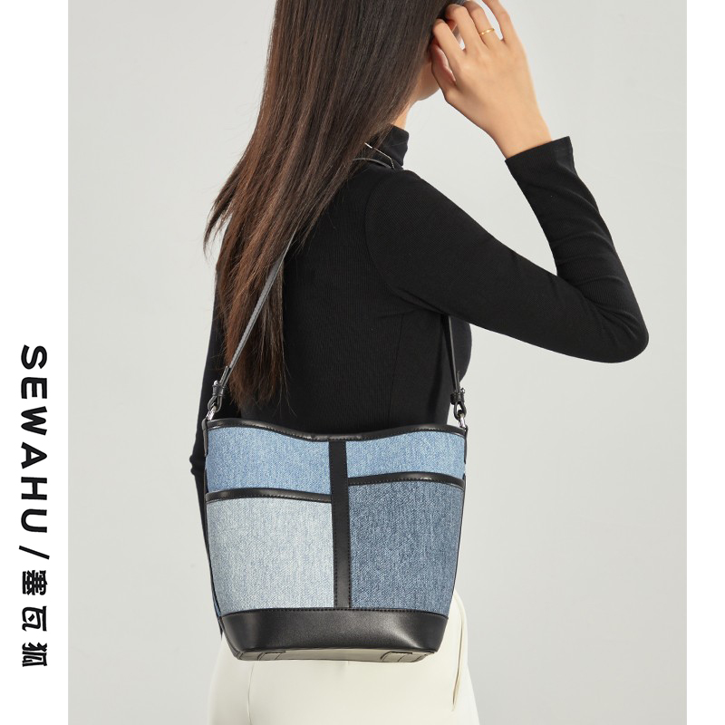 2025新款牛仔撞色水桶包女通勤大容量单肩斜挎包小众腋下包手提包