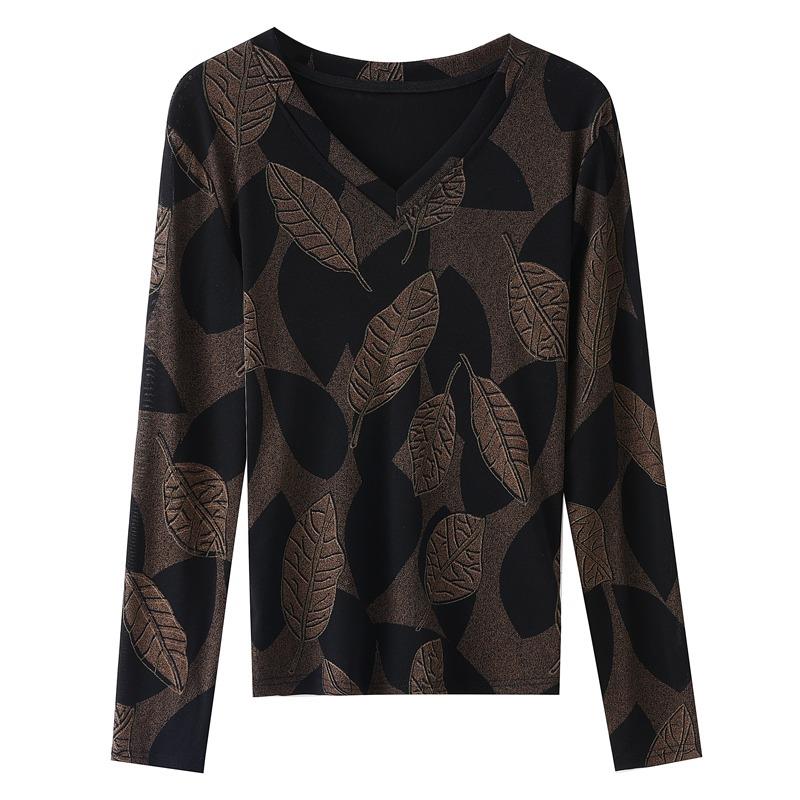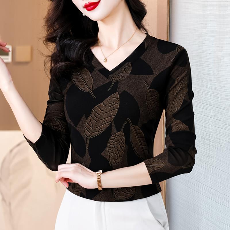 中年妈妈秋装v领印花网纱长袖t恤女士秋款弹内搭小衫打底上1003h
