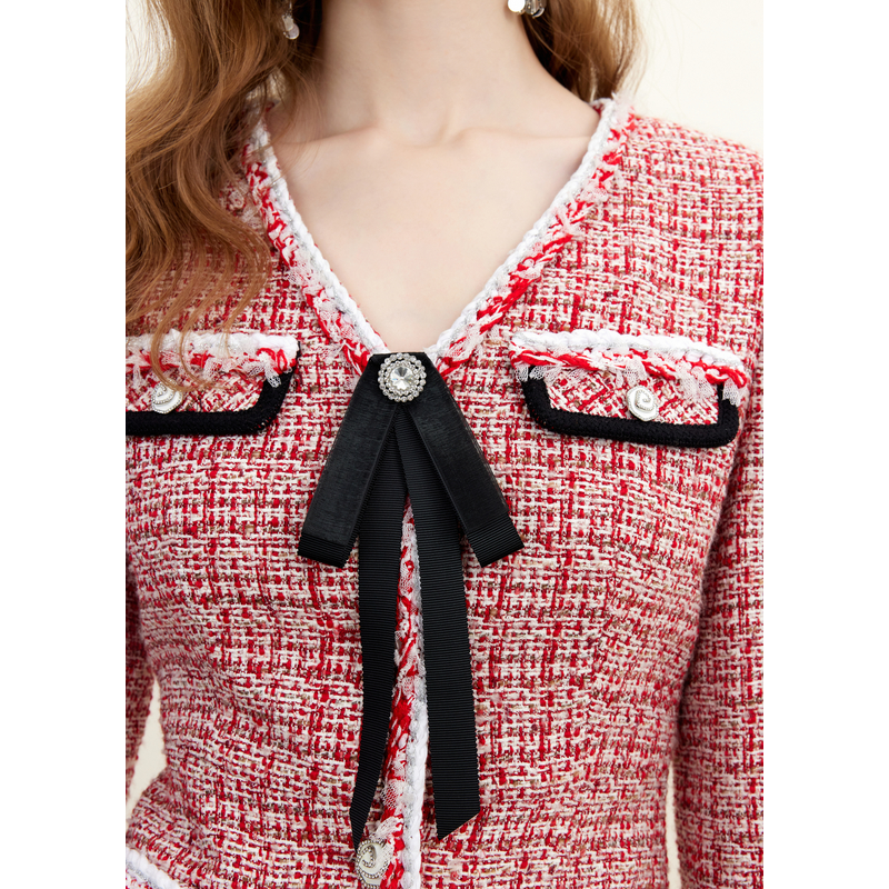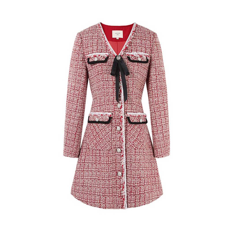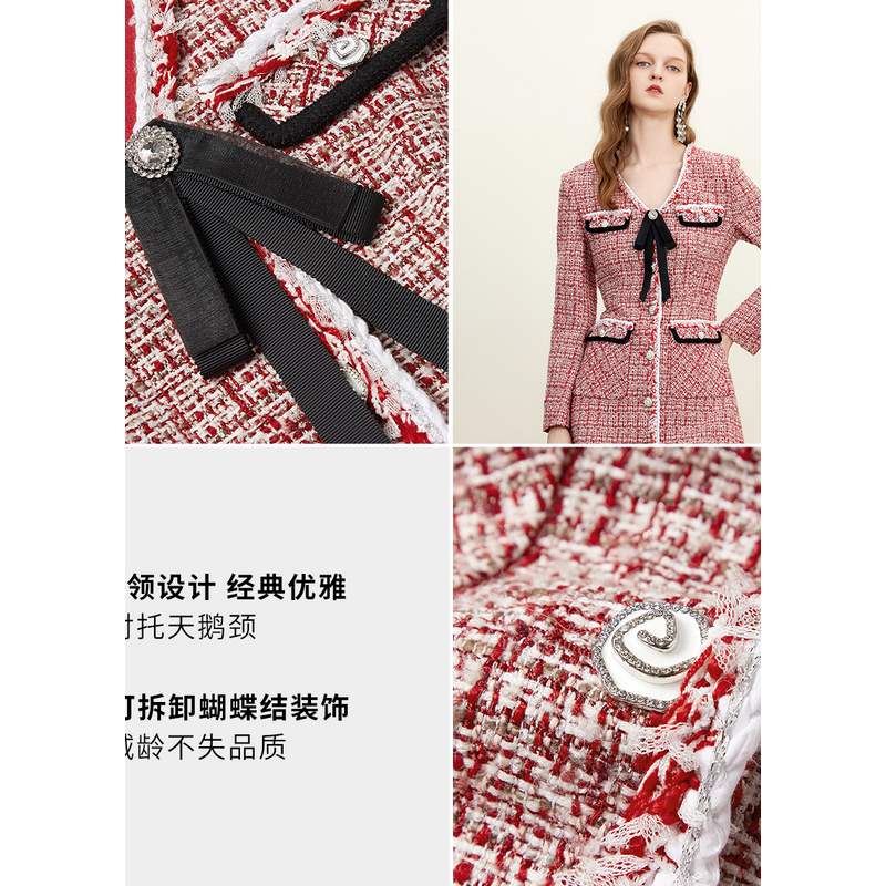 missCOCOON时尚V领中长款裙子2023冬新女长袖撞色气质香风连衣裙