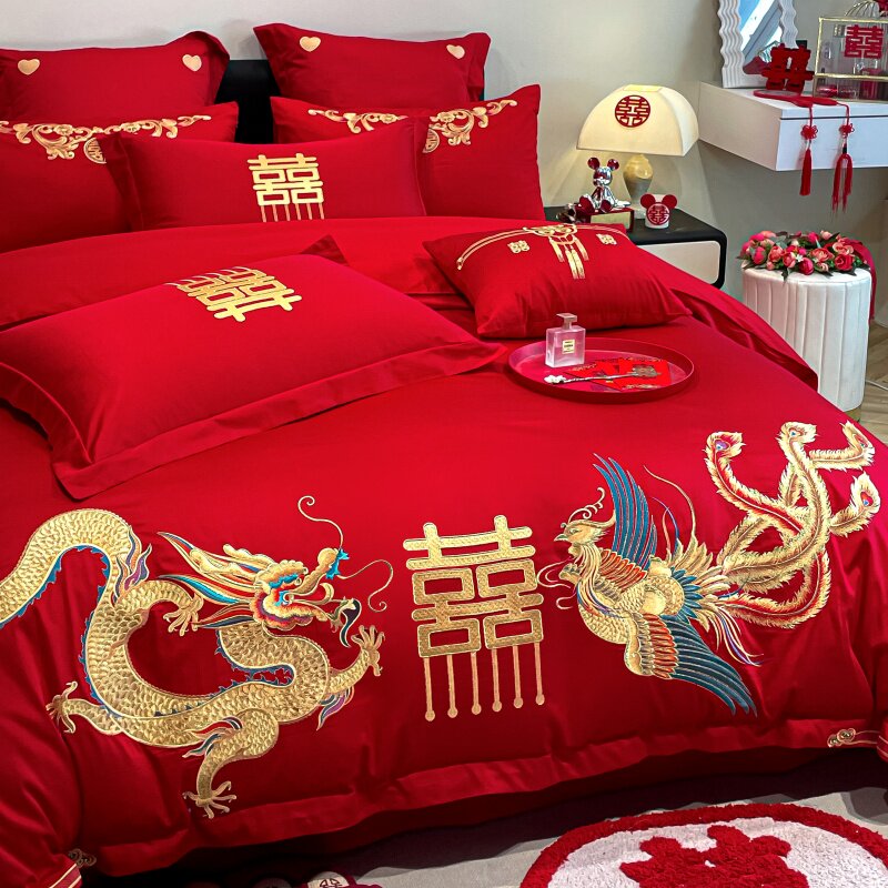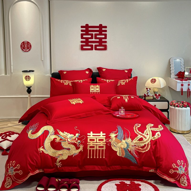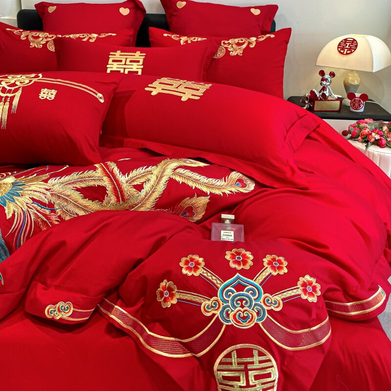 大红中式婚庆长绒棉四件套刺绣纯棉被套床单结婚床上用品
