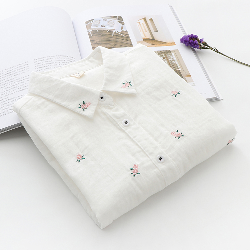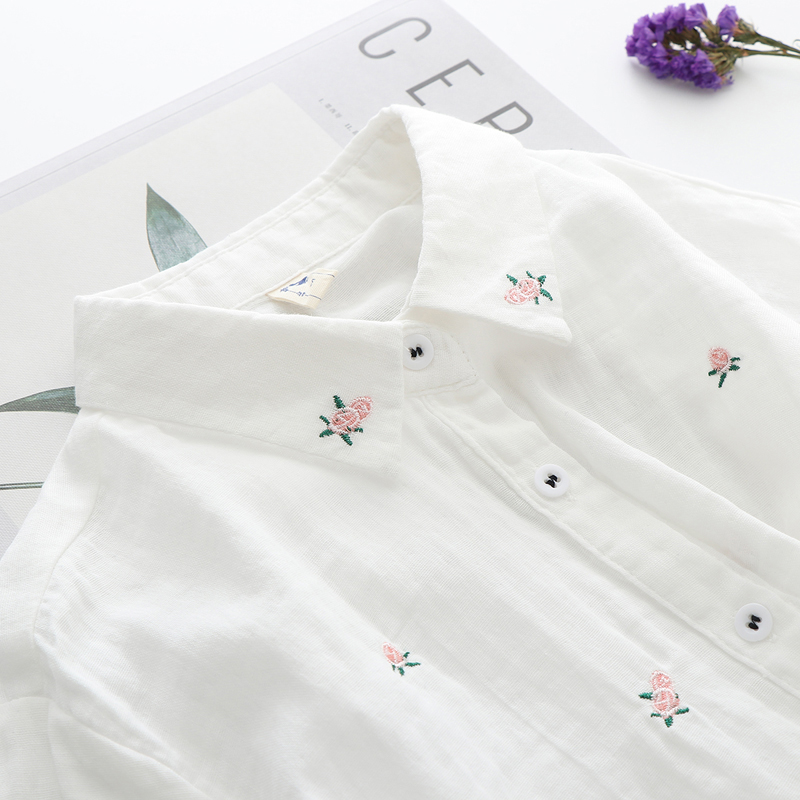 2025春秋装白色双层棉纱长袖衬衫女韩版文艺刺绣碎花全棉柔软衬衣