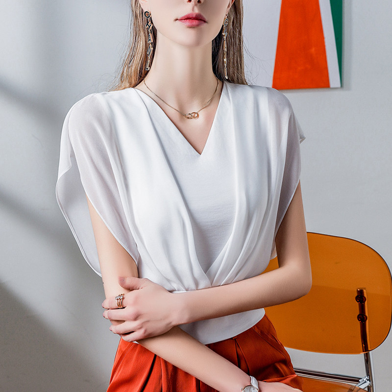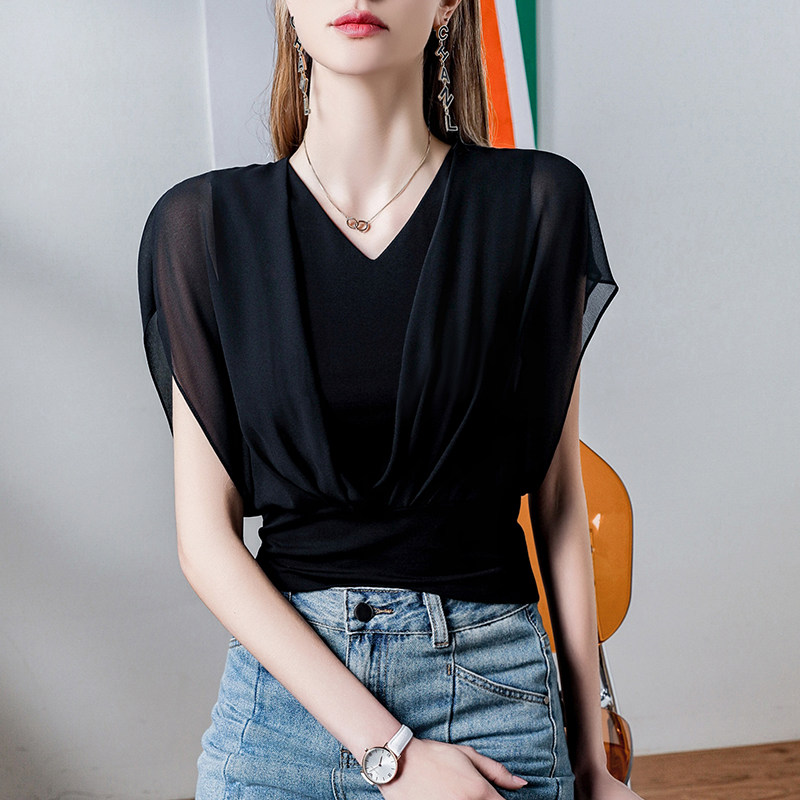 2025夏季新款雪纺蝙蝠袖拼接V领T恤女短袖修身设计感春夏洋气上衣