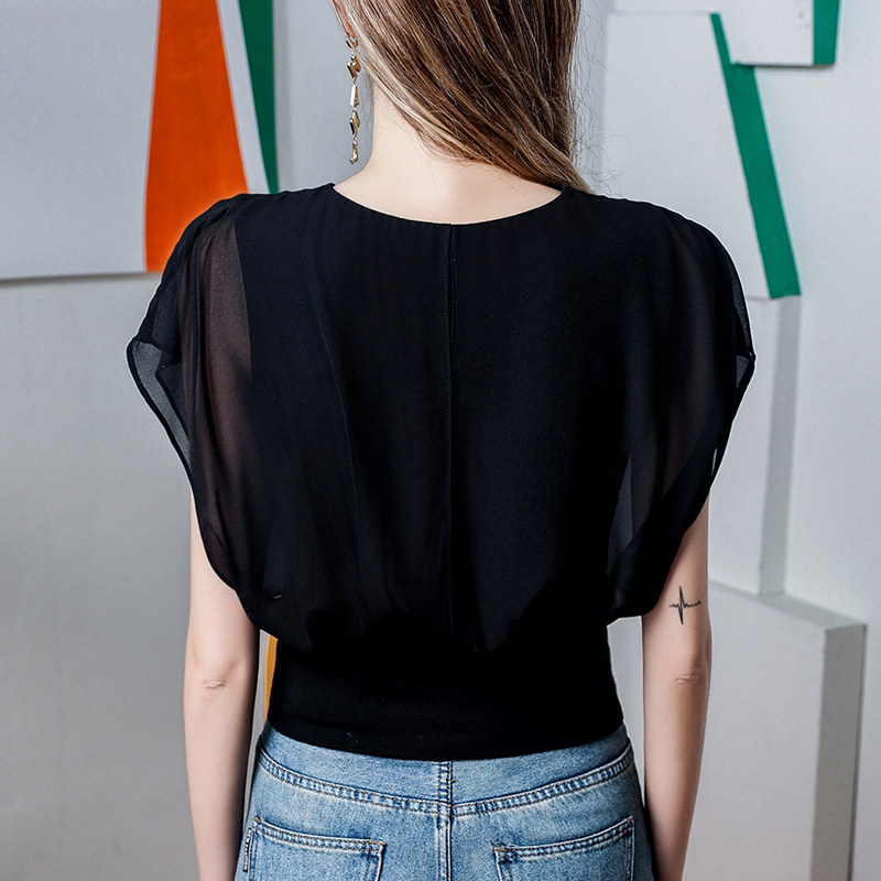 雪纺蝙蝠袖拼接V领T恤女短袖
