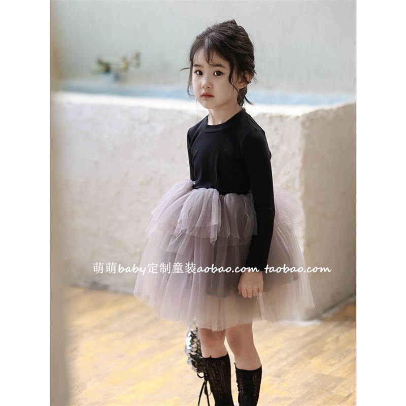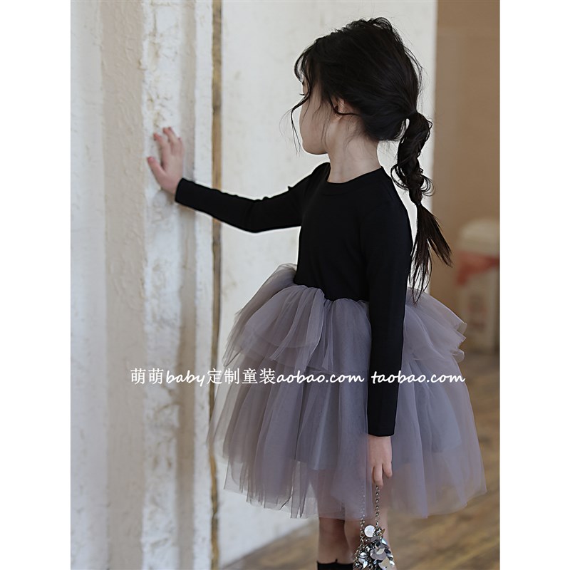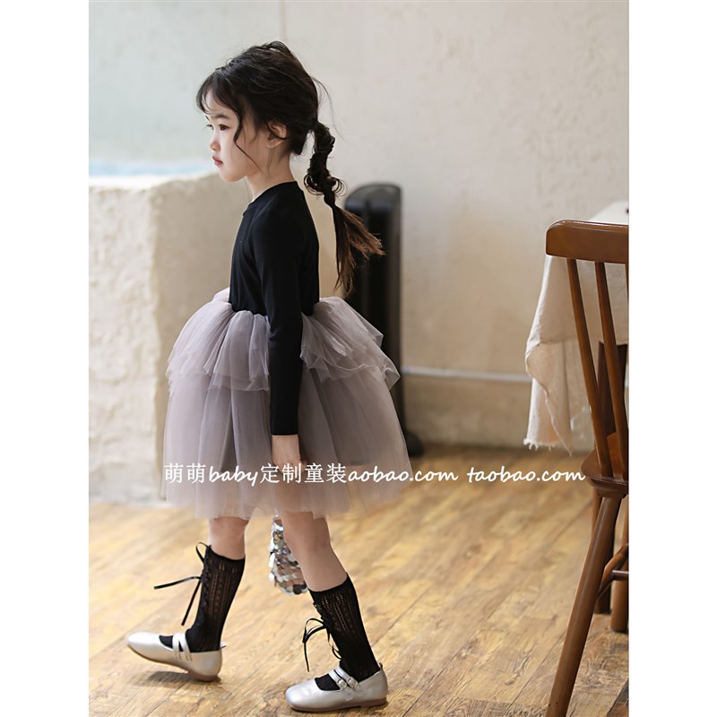 女童高级灰网纱蛋糕裙长袖连衣裙2025春夏款小女孩舞蹈裙公主裙子