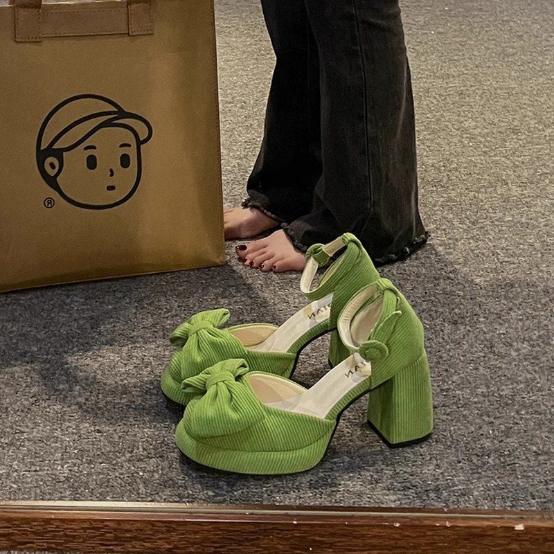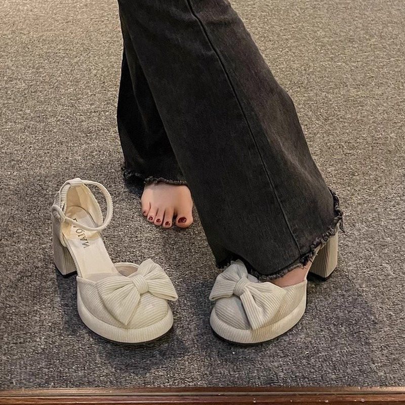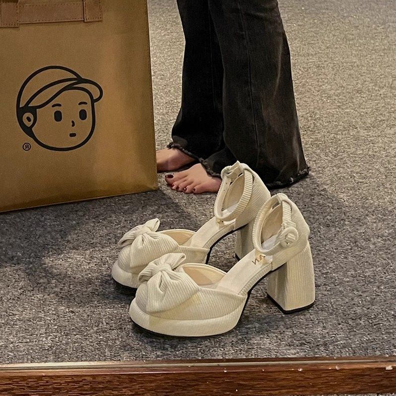 法式玛丽珍凉鞋女2024夏季新款时尚绝美粗跟中空单鞋蝴蝶结高跟鞋