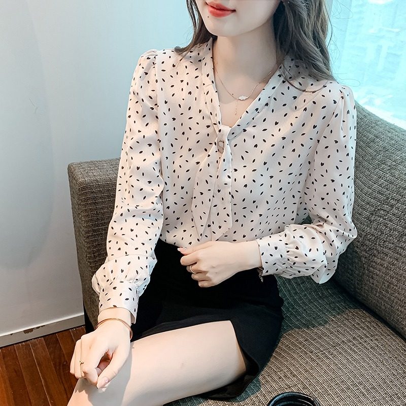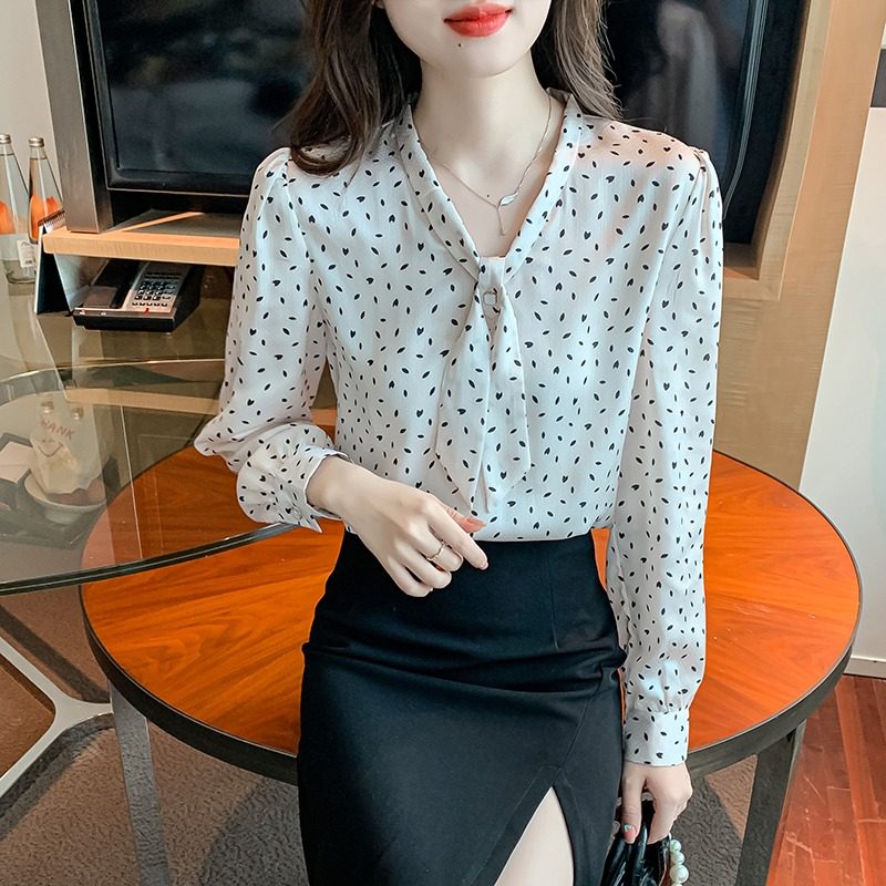 波点雪纺衬衫女2026春季新款法式气质v领飘带衬衣长袖上衣打底衫