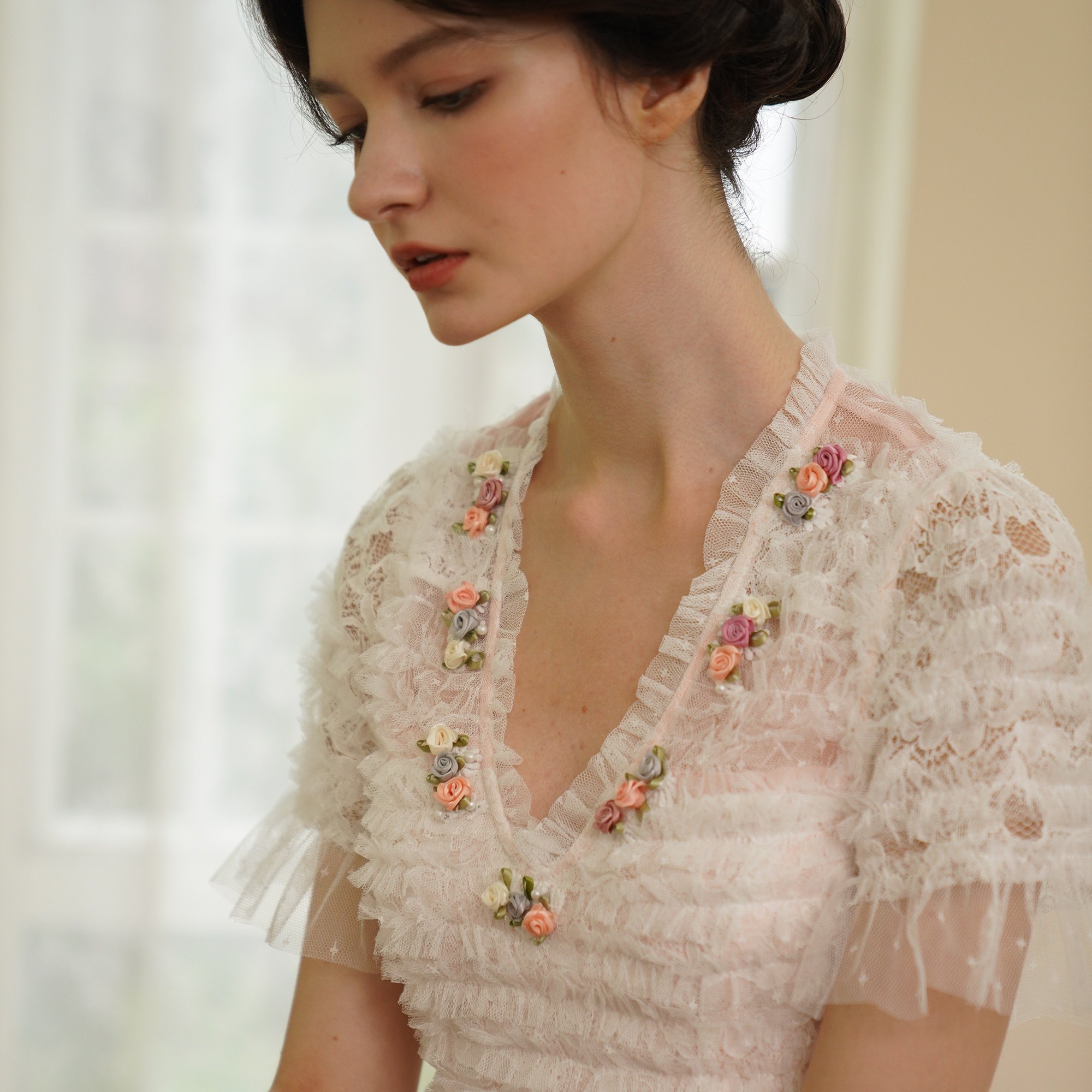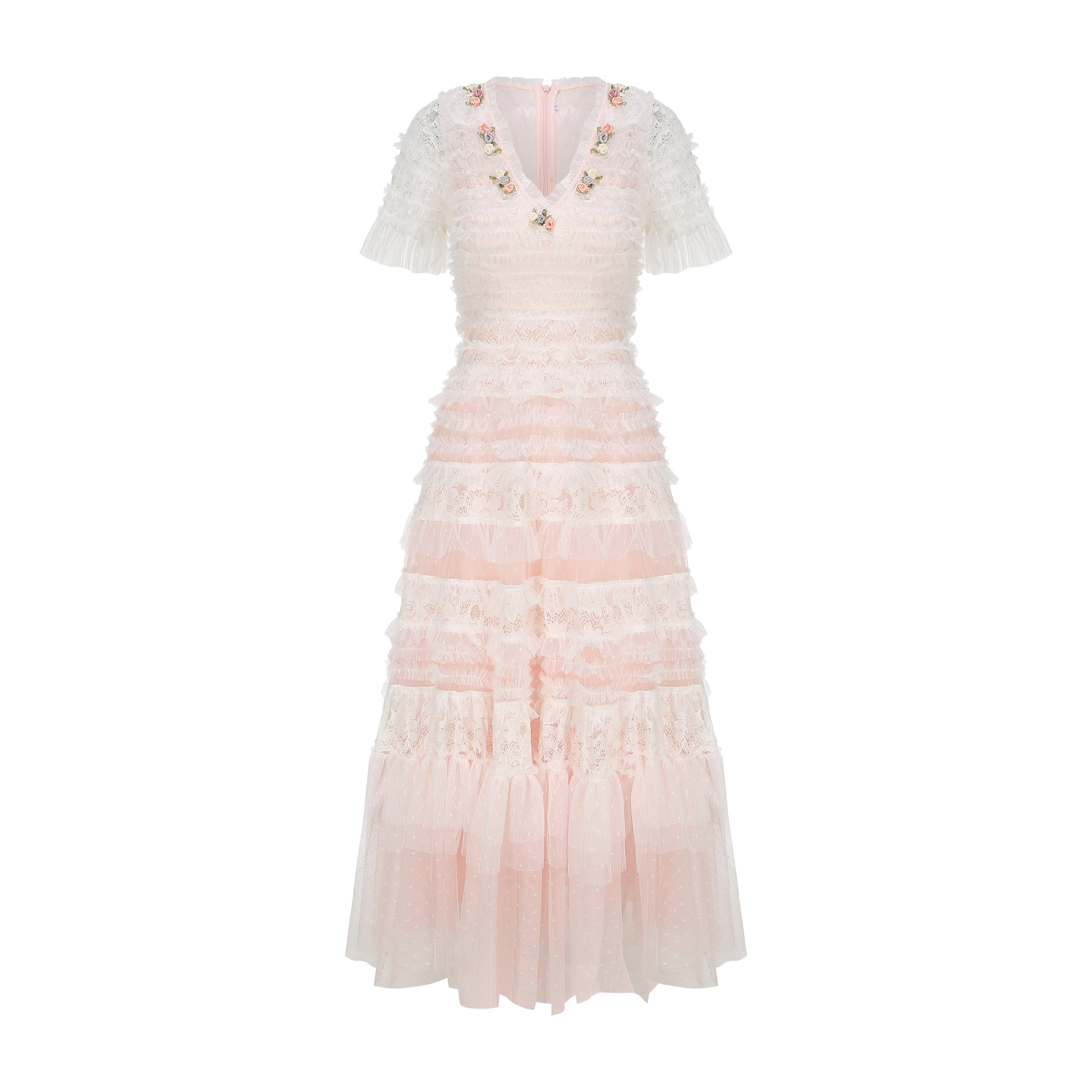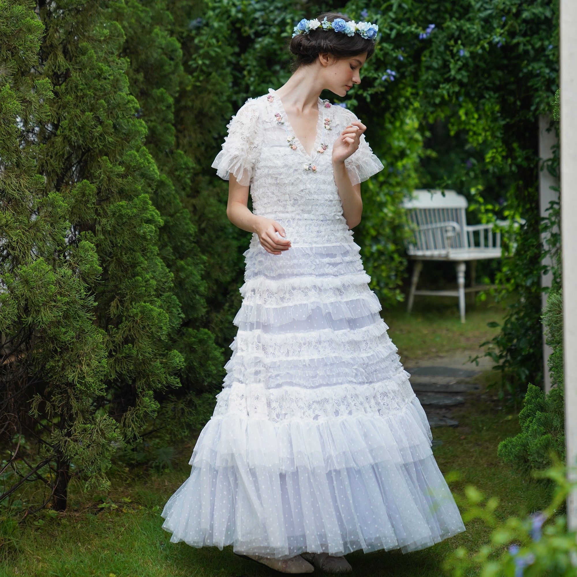 脸儿艺 手工立体盘花 法式V领 水粉 浅蓝 蛋糕裙 修身大摆连衣裙