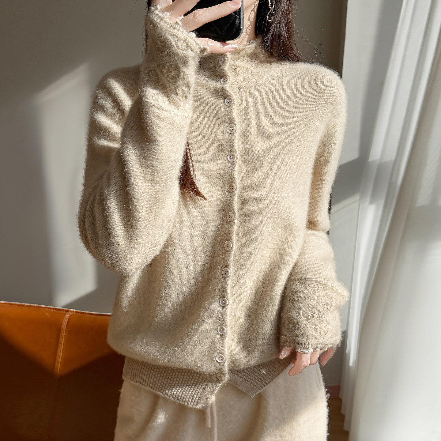 慵懒松弛感100%纯羊毛开衫女半高领镂空钩花针织毛衣宽松羊绒外套