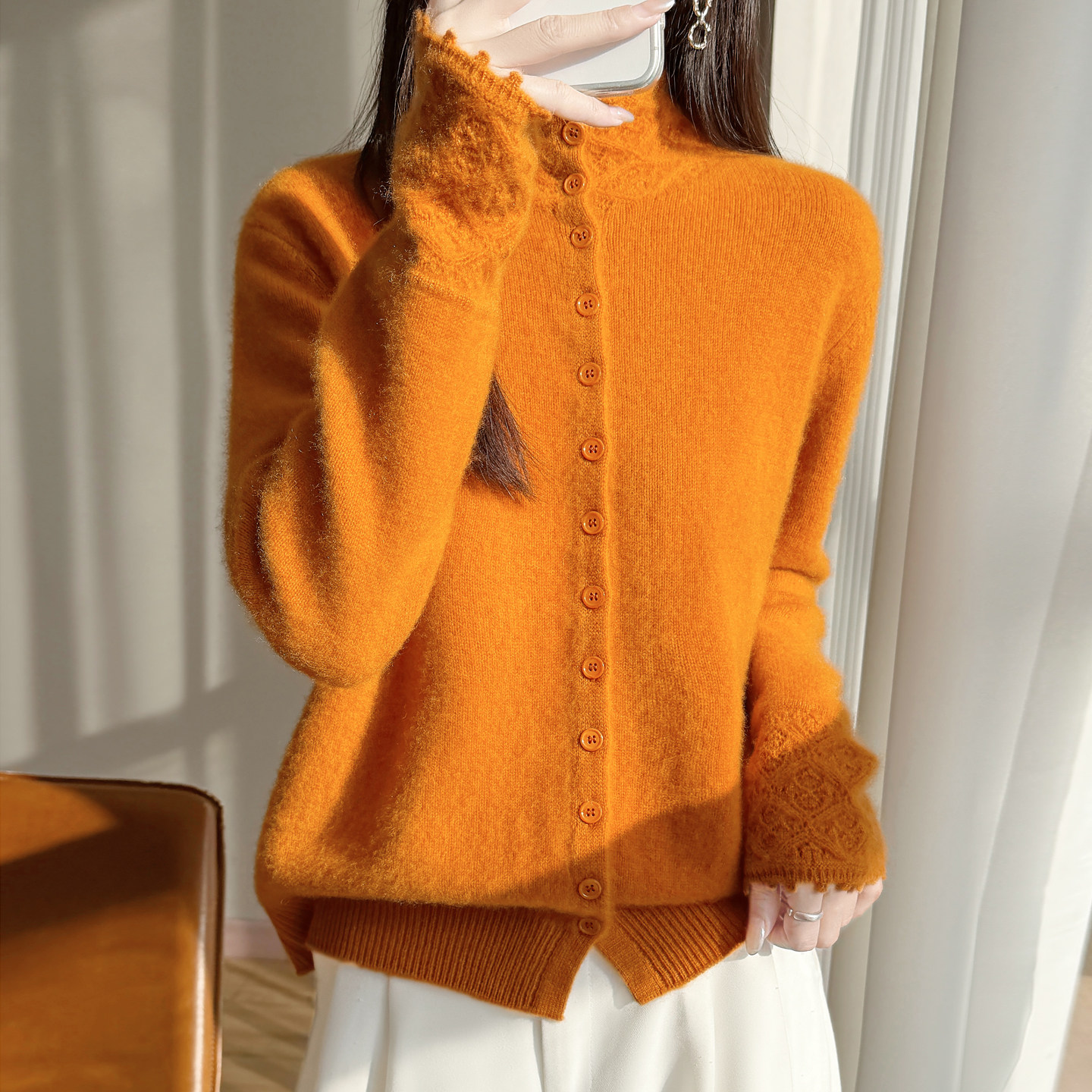 100%羊毛半高领镂空钩花开衫外套